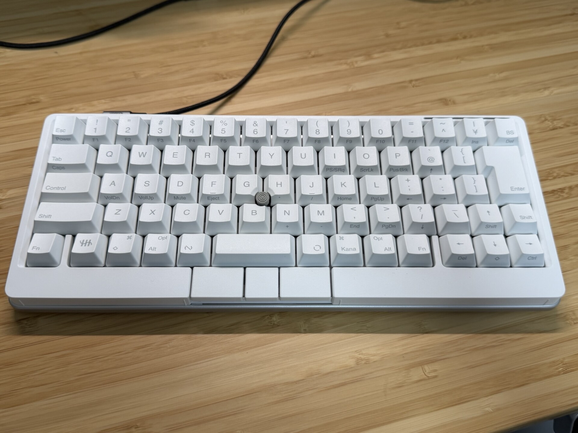 もちろん日本語配列で色は「雪」を選びました。HHK Studioは当初、自分が嫌いな文字の視認性が悪い「墨」色しかなかったのですが、あとから「雪」モデルが発売されました。ポインティングスティックの部分のキーの切り欠きがあるので、他社のCherry MX互換のキーキャップに交換は出来ませんから、色を後から変えるのは困難です。