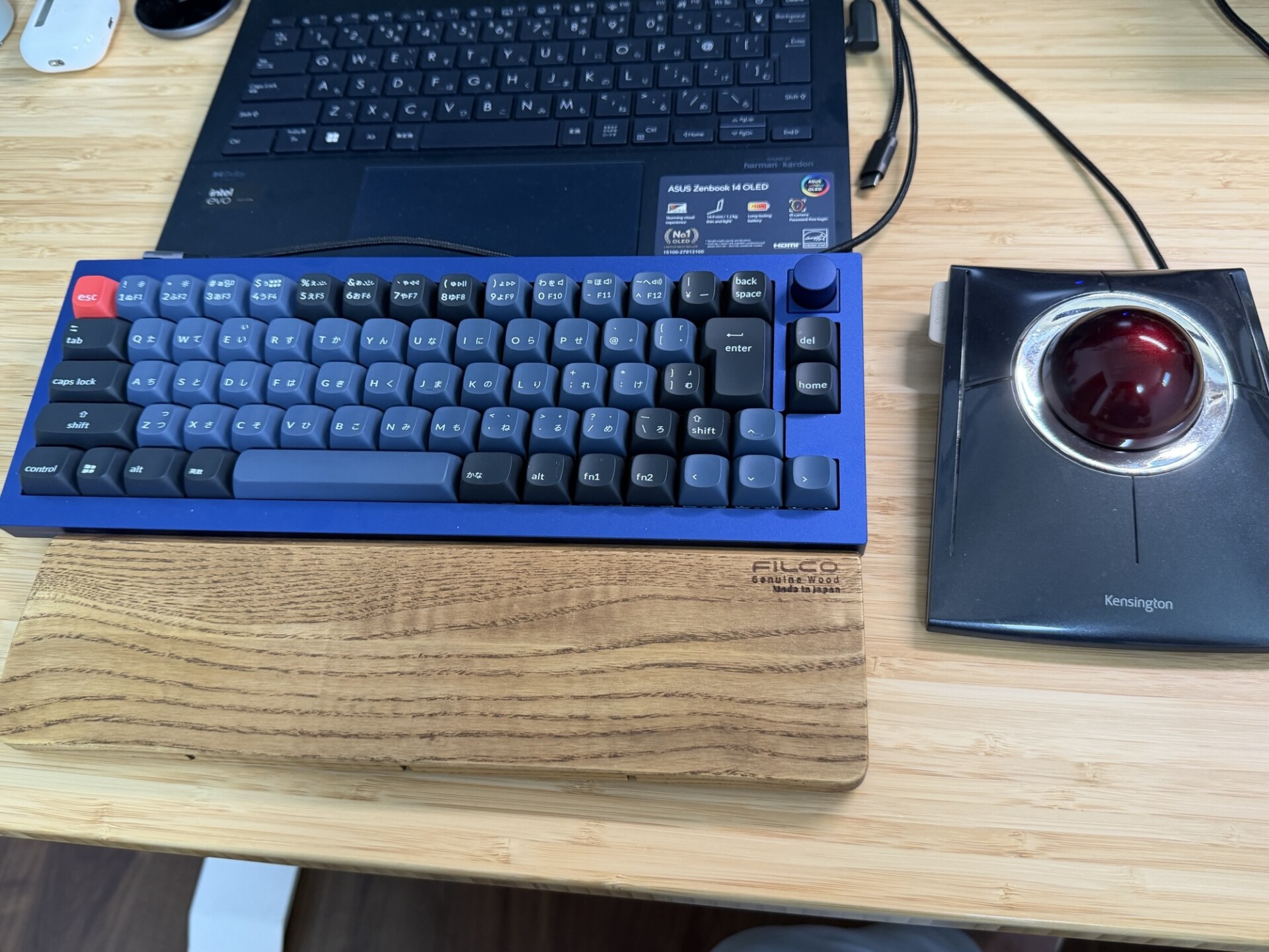という訳でQ2は現在、お仕事用のノートPCの手前に置いて、Kensingtonのトラックボールと並べて使ってます。ファンクションキーがないことで縦幅が狭いのがスペース的なメリットです。HHKよりも最下段のキーが2個少なく、スペースバーやモディファイヤーキーの横幅が広くて押しやすいのがKeychronの配列の好きなところです。