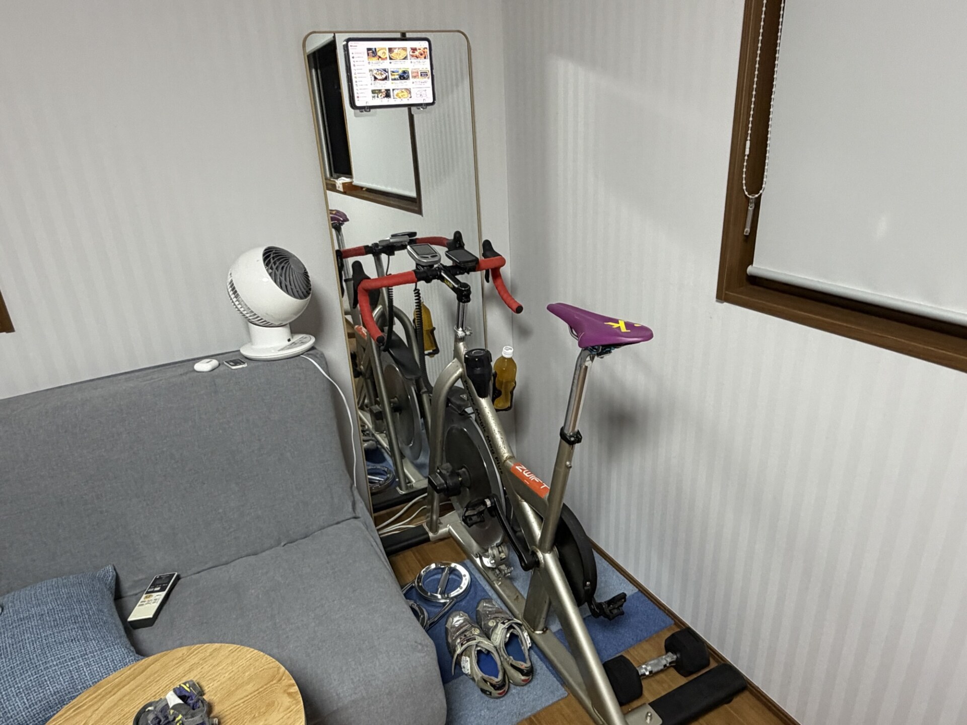 減量したことでお腹の肉が減ってポジションが変わりました。ハンドルを下げてサドルを後ろに引きます。この固定バイクはクランク長が170mmでして、普段乗っているロードバイクは172.5mmです。それ以外は現在乗っているロードバイクとだいたいポジションを合わせられました。