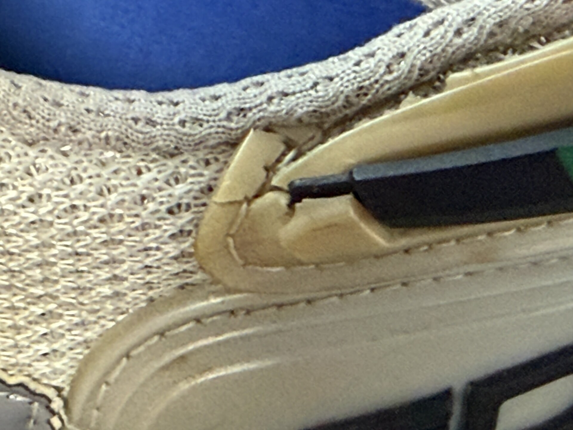 しかし、踵をホールドするヒールを押さえるところのプラパーツが劣化してバキバキに割れてきました。この状態でペダルを踏むと、シューズから「ギュッギュ」という異音が発生します。流石にもう寿命ですね。