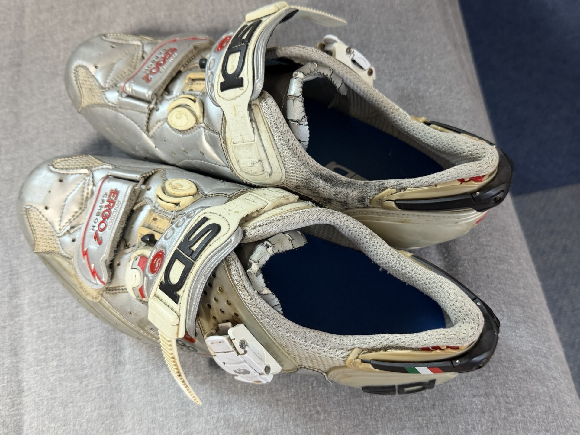 このシューズですが、ロードバイクを始めた最初期の購入したSIDIのERGO2という年代物です。多分、購入して10年以上は経過していると思いますが、ローラーでしか使ってないので長持ちしてました。エナメル表皮とカーボンソールは経年劣化は感じられません。