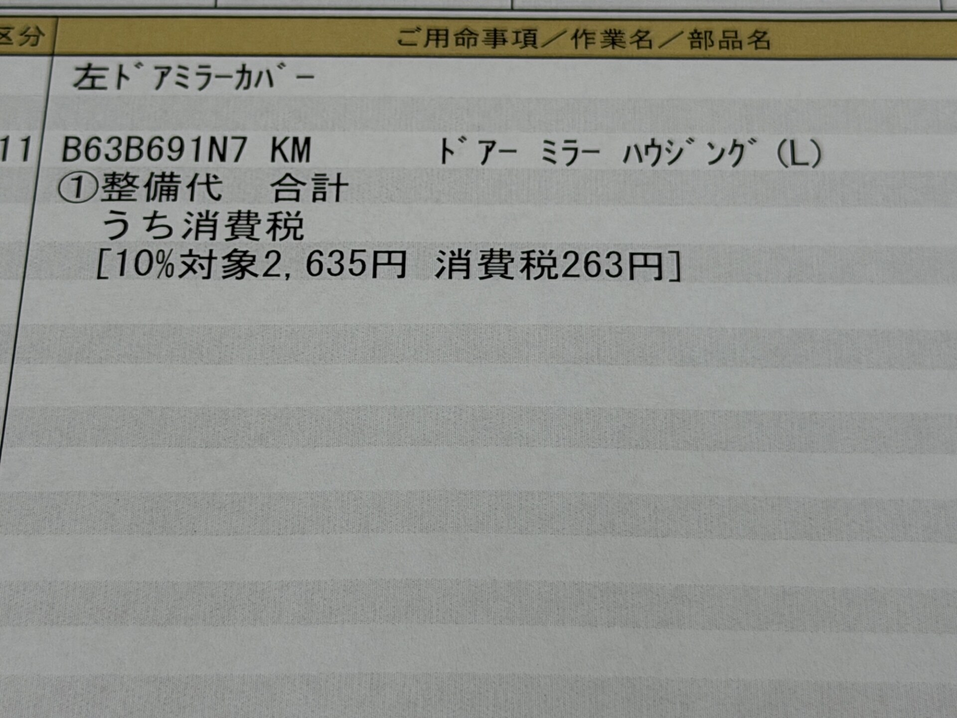以前に貼った母親が運転していたときに擦った、と思われる左のドアミラーのカバーです。セラミックメタリックというボディー色がレアなこともあって、通販では部品の入手は難しそう。なので、ディーラーで営業マンの方に状態を見せて、このカバー部品を注文します。