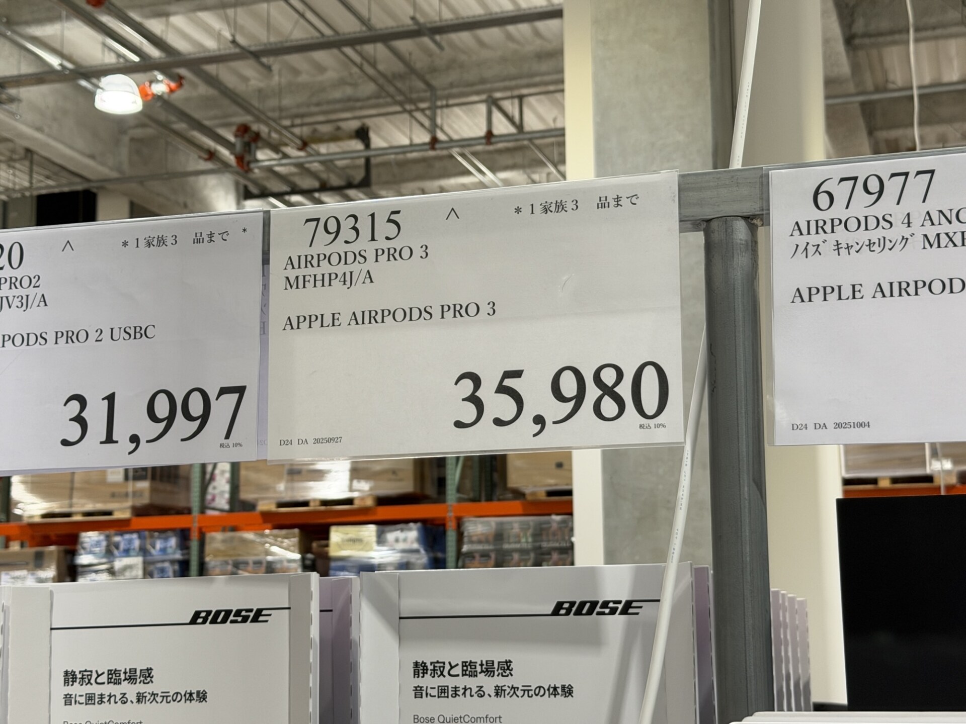 9月に発売になったばかりのAppleのAirPod Pro3が、コストコの店頭にも置いてました。アップルストアだと39800円ですから、それよりも4000円安いです。自分はコストコで売るようになったらPro2から買い替えようと思っていたので、これも買ってきました。そういえばPro2もコストコで買ったんでしたね。
