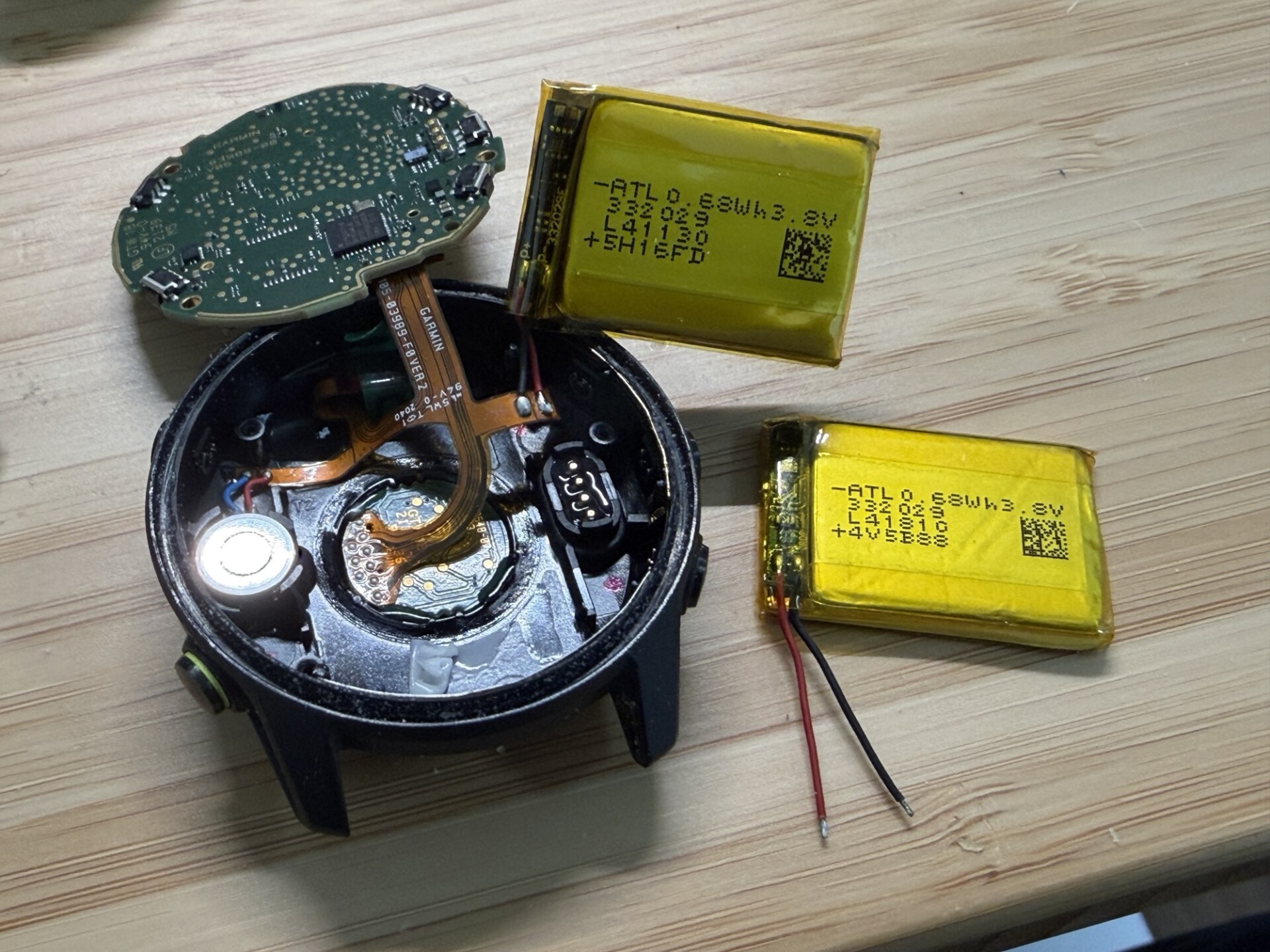 作業は無事に終わったのですが、接着の後に動作確認したらディスプレイのコネクタがちゃんとハマっていなくて、文字盤の表示が乱れます。しかたなく接着を剥がしてやり直したのですが、慣れない作業で無駄な時間を使ってしまいました。それでも2時間ほどの作業でちゃんと交換ができまして、電池の持ちが倍ぐらいに回復しました。