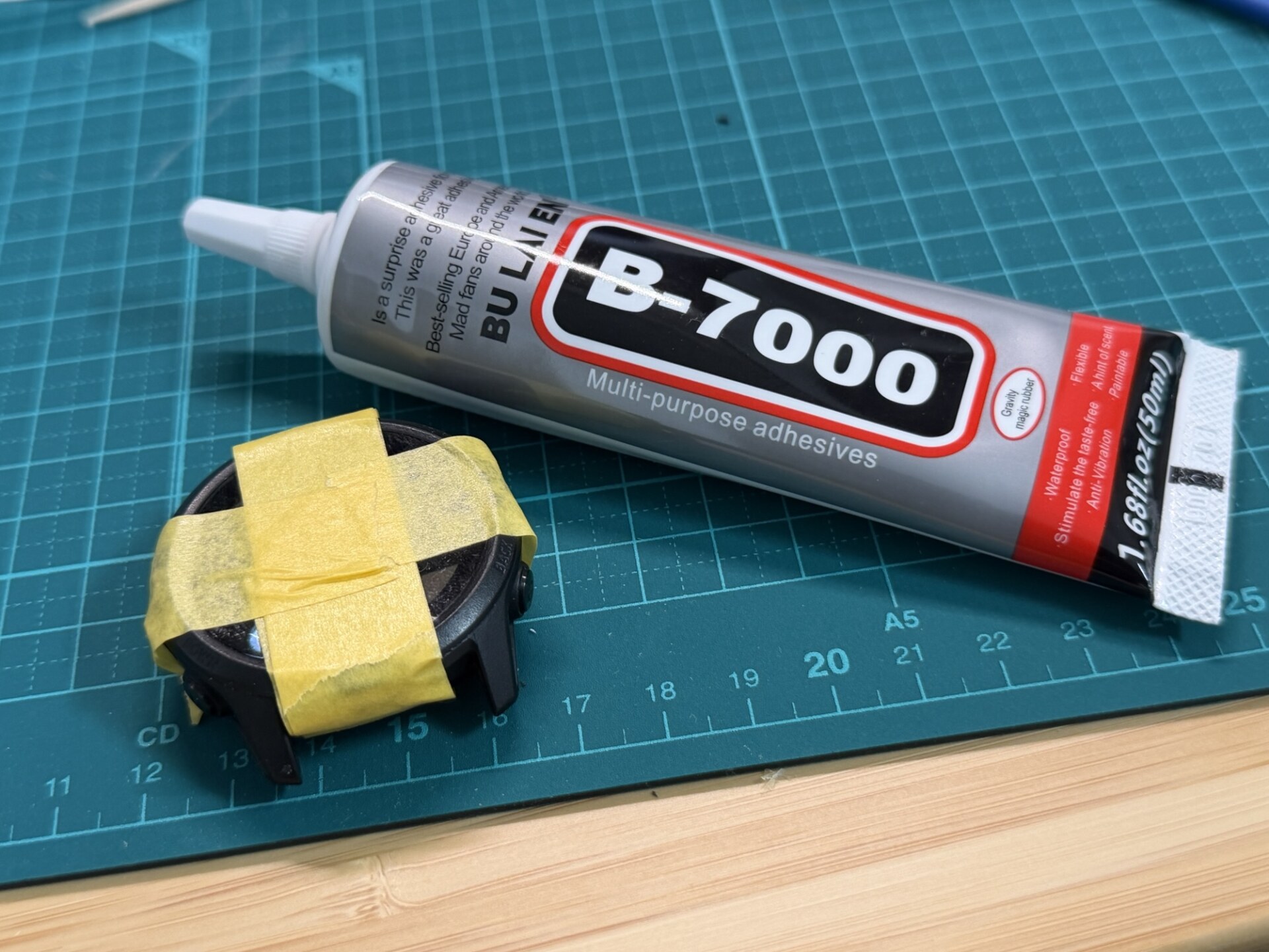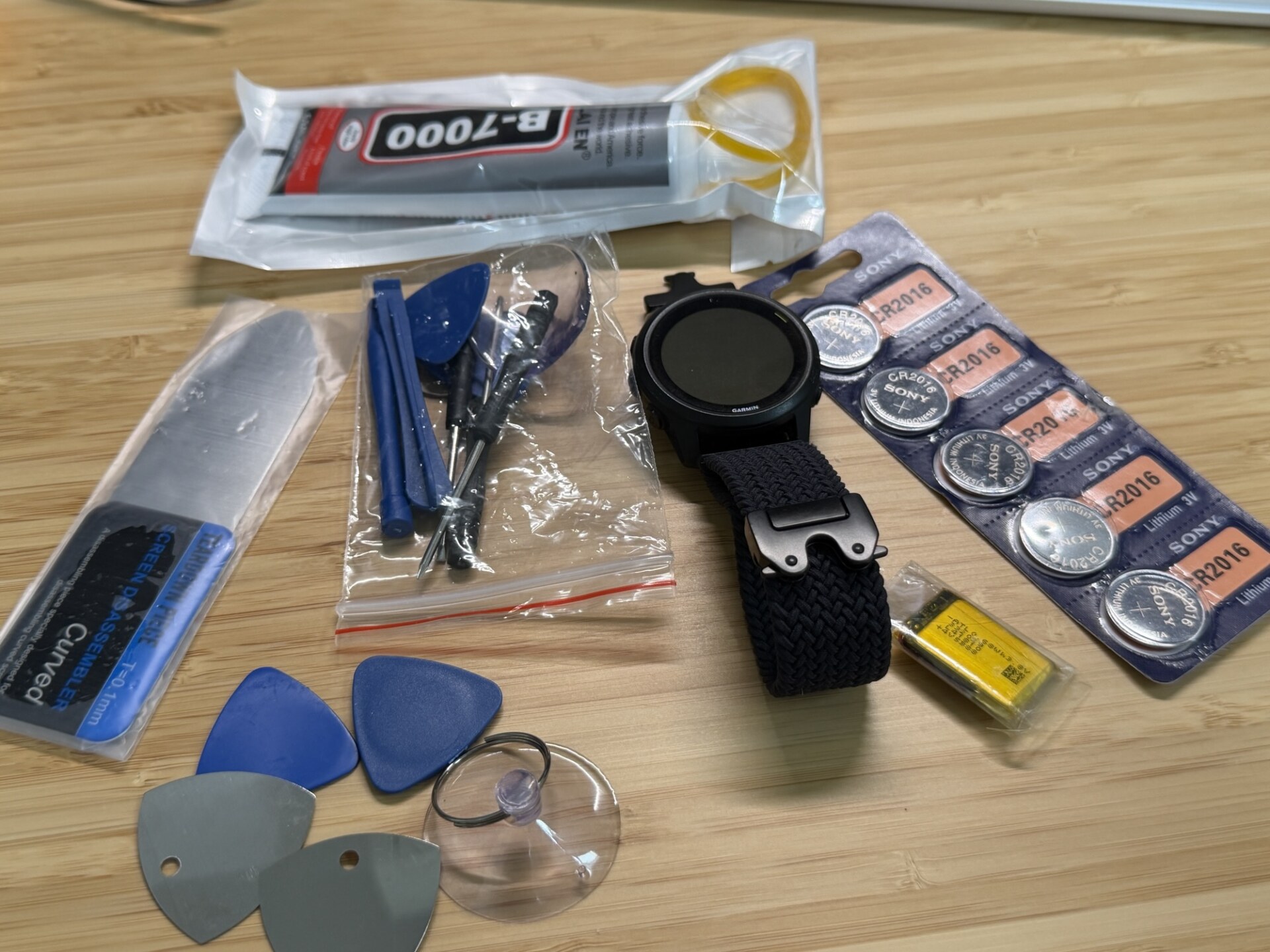 なのでForeAthlete 745の分解動画をYouTubeで検索したり、互換電池を売っている通販サイトを検索してみました。交換用電池はAliExpressで800円程度で工具付きで売っているのが簡単に見つかりました。それから電子機器の接着によく使用されるB-7000という接着剤も、AliExpressで数百円で販売されていたので一緒に購入します。届くまで2週間ほど掛かって無事に手元に届きました。