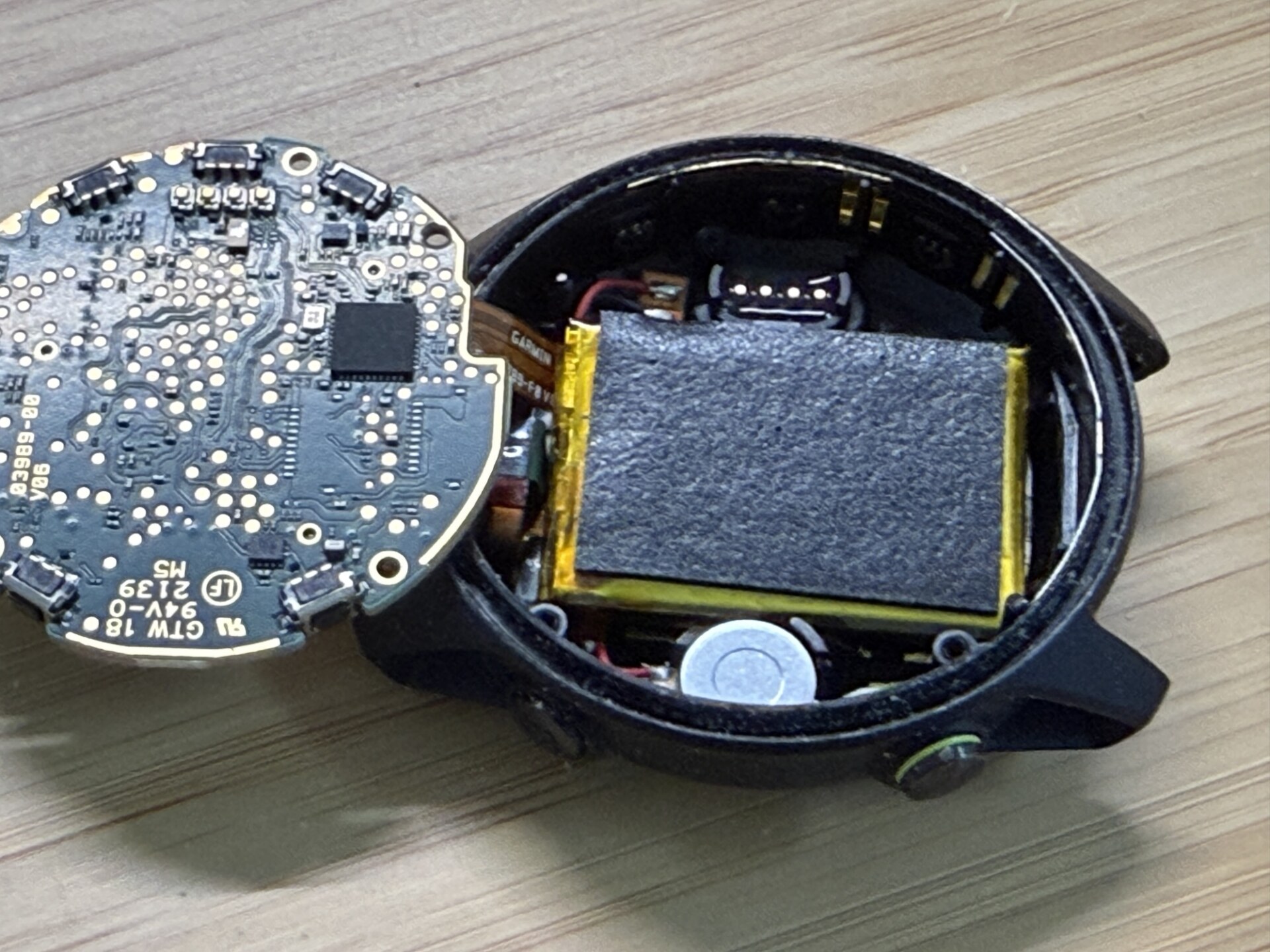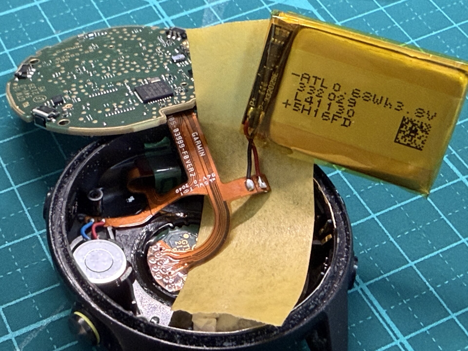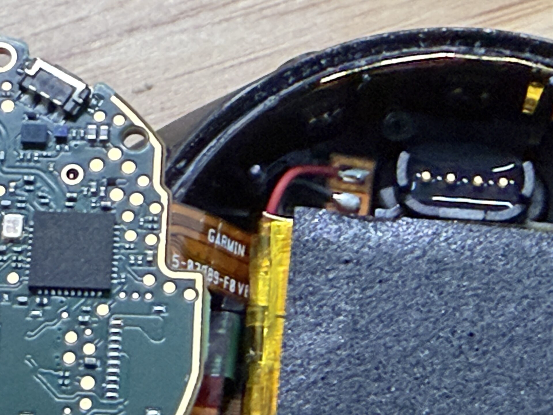 電池はフレキにハンダ付けされています。最近のGarminの機種では、ここがコネクタになっていて交換が容易になっている機種がありますが、このころのForeAthleteやForeRunnnerはハンダ付けされているようです。極小というサイズではないので、普通の電子工作用のハンダゴテで作業出来ます。
