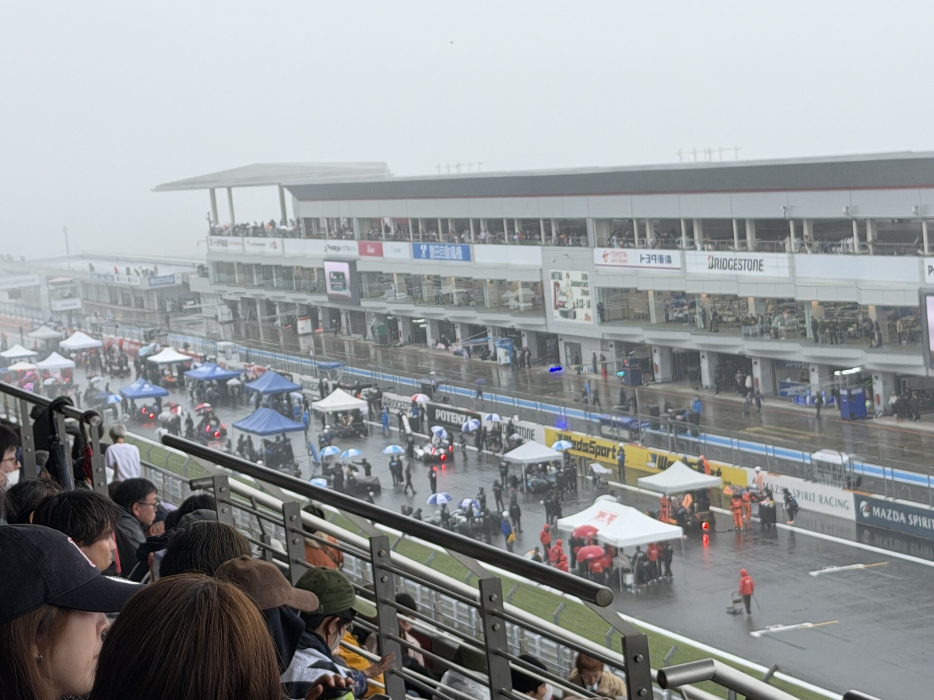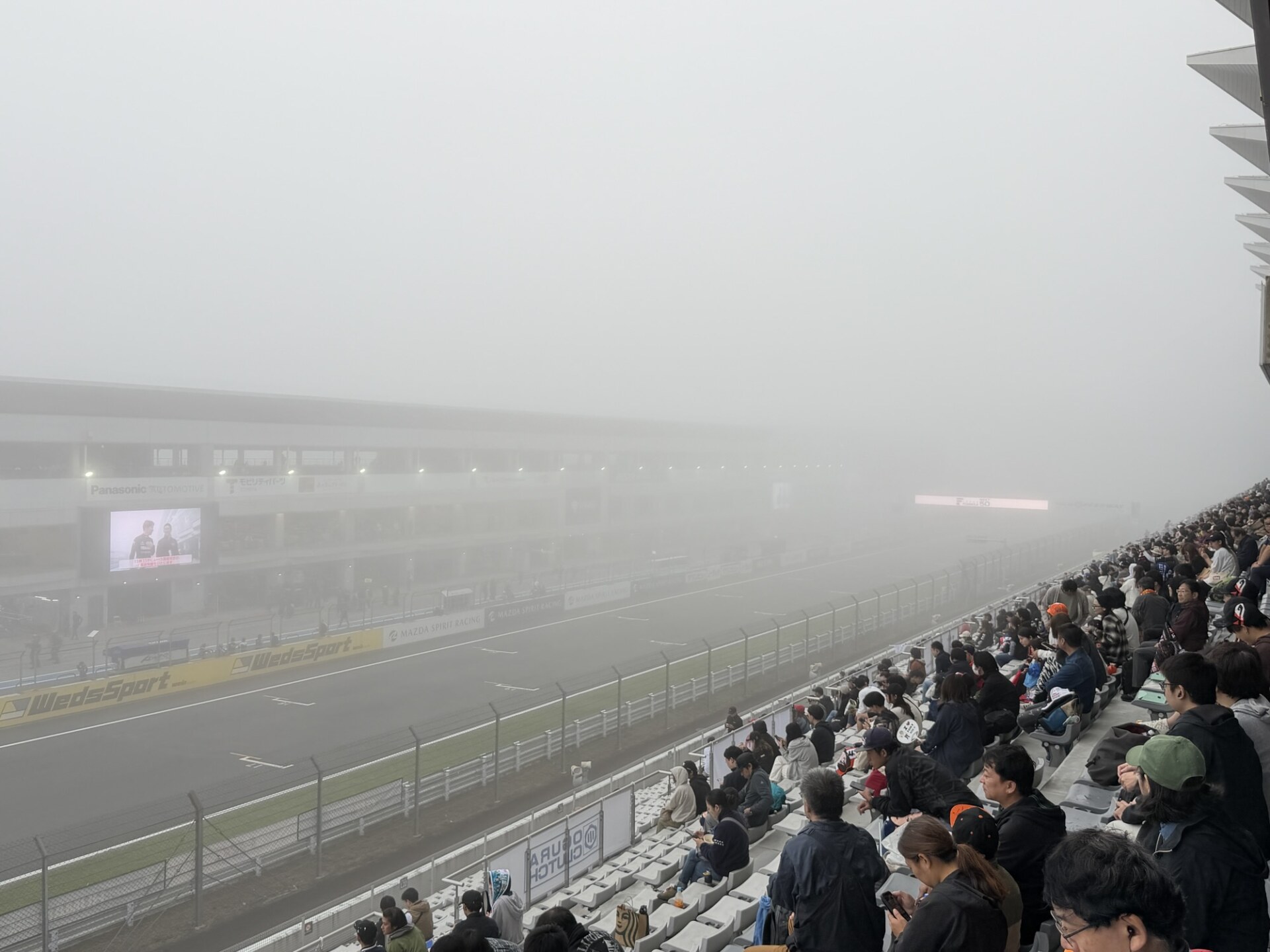 スタート進行が始まる14時の1時間前ぐらいから、富士スピードウェイ全体を濃い霧で包まれるようになってきました。風があれば霧もすぐに晴れるのですが、かなり濃い霧で全く晴れる感じがありません。これだとレースのスタート時刻は延期になるかも?