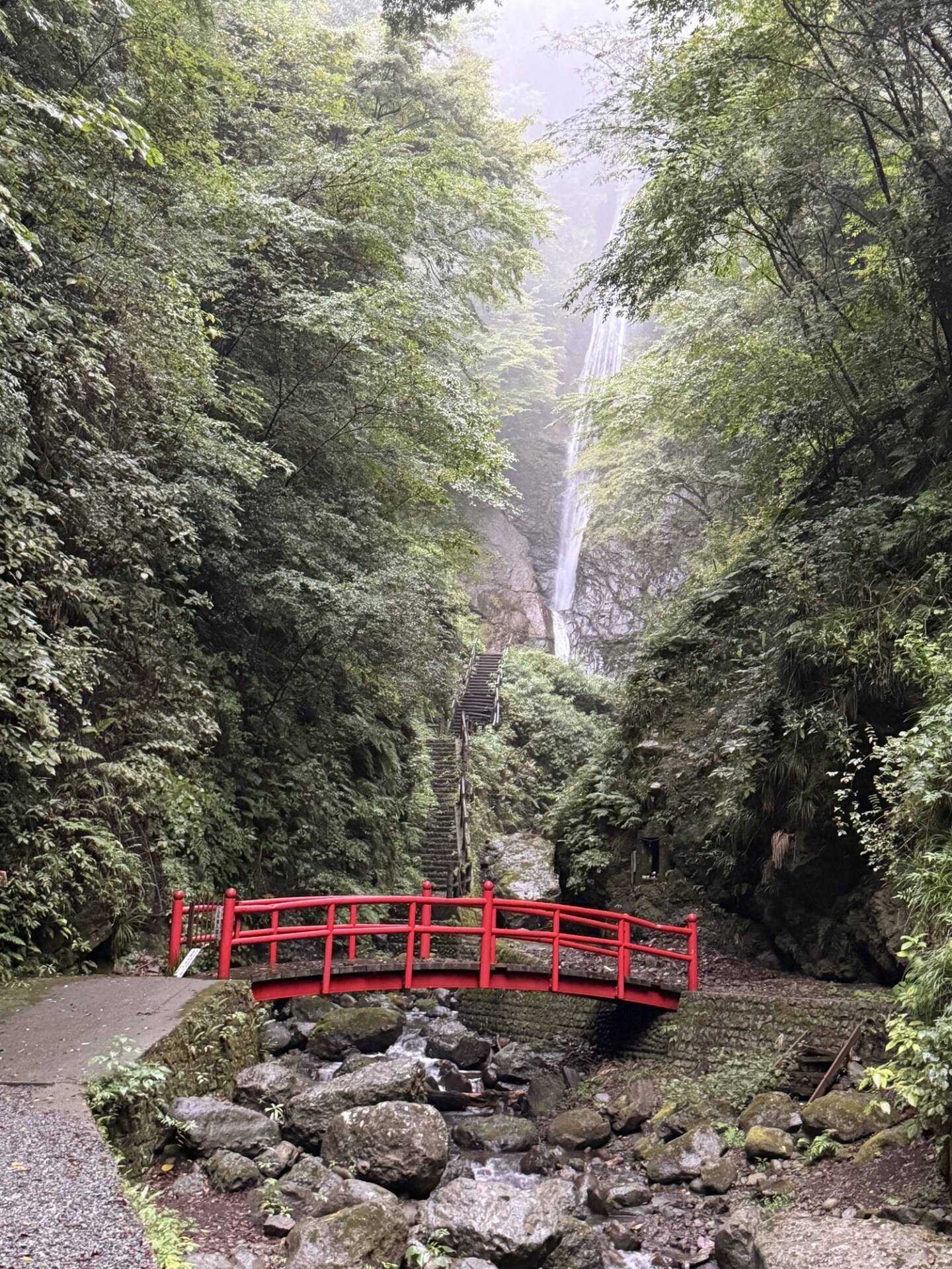 宿の急坂を歩いて下りて、そこから滝が見える所まで遊歩道が整備されています。思ってたよりも本格的な有名観光地みたい。徒歩7分で滝を下から見上げるスポットに到着しましたが、早朝だけに誰もいないし、地面は濡れてて滑らないか心配でした。