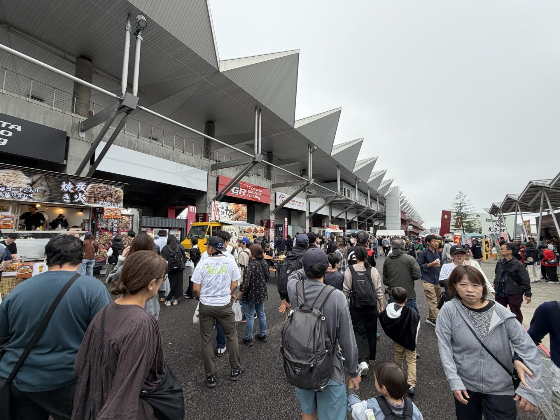 場内の自動販売機でペットボトルを買うと250円、キッチンカーや常設のテナントのランチは1000~1500円ぐらいと観光地価格ですが、お客さんはバンバン買ってますね。どうもケチな我々はサーキットのお金を落とさずに、持ち込んだものを飲み食いする習性は治らないようです(笑)