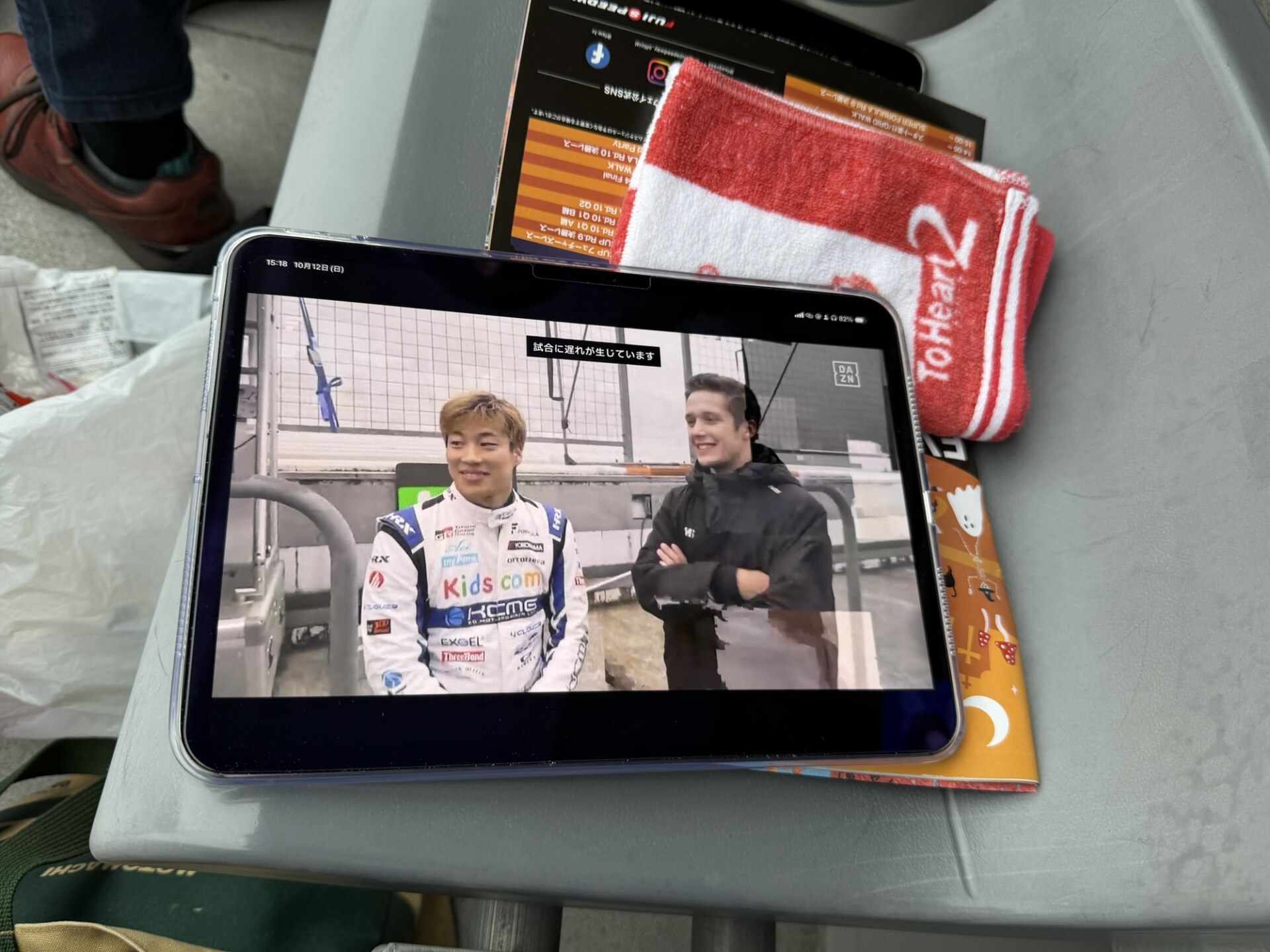 スタート延期が続くので、ピットリポートとして選手やメカニックのインタビューが続くのですが、音声はFMで聞こえるものの、モニターが霧で見えません。仕方ないのでタブレットでDAZNの中継を遅れて観てました。DAZNはリアルタイムより30秒ほど遅延があるんですよね。