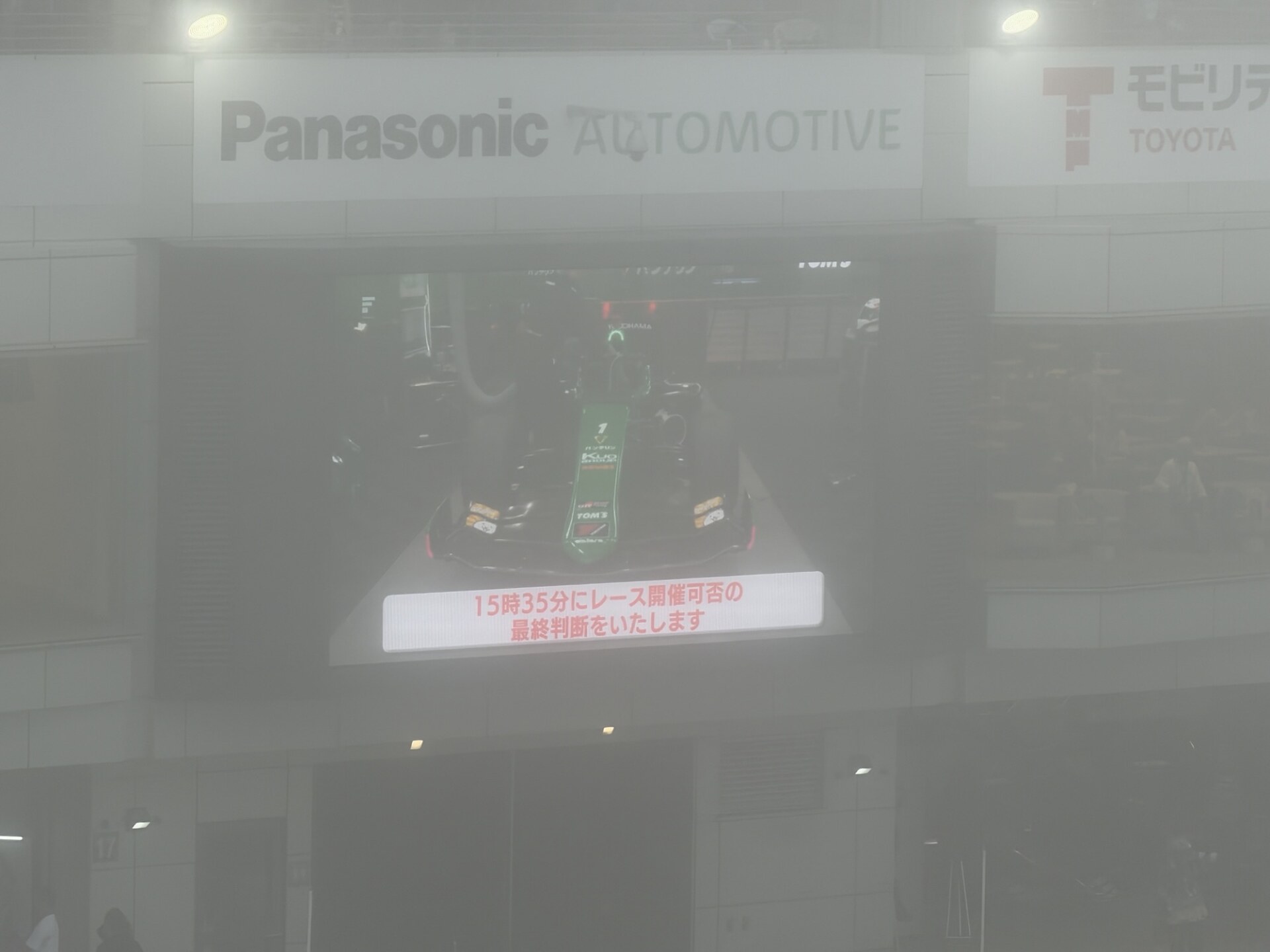 iPhoneで撮影すると文字が読めるのですが、肉眼ではモニタの文字が読めない霧の濃さです。1時間35分の順延の後、レース開催は無理ということで中止が正式にアナウンスされました。富士SWの悪天候は今に始まったことではないですが、霧がここまで晴れないのは珍しいかな。