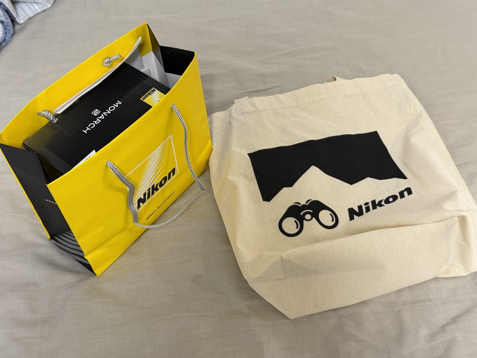 2万円をカード決済で払って、無事にお持ち帰り。ニコンの双眼鏡のトートバッグをオマケしてくれました。これでアウトレット販売の在庫は12×42のHGモデルという7万円もするモデルのみ。リストを見ると10~15台ぐらい販売していたようですが、想像以上に好評であっという間に売れたとのこと。