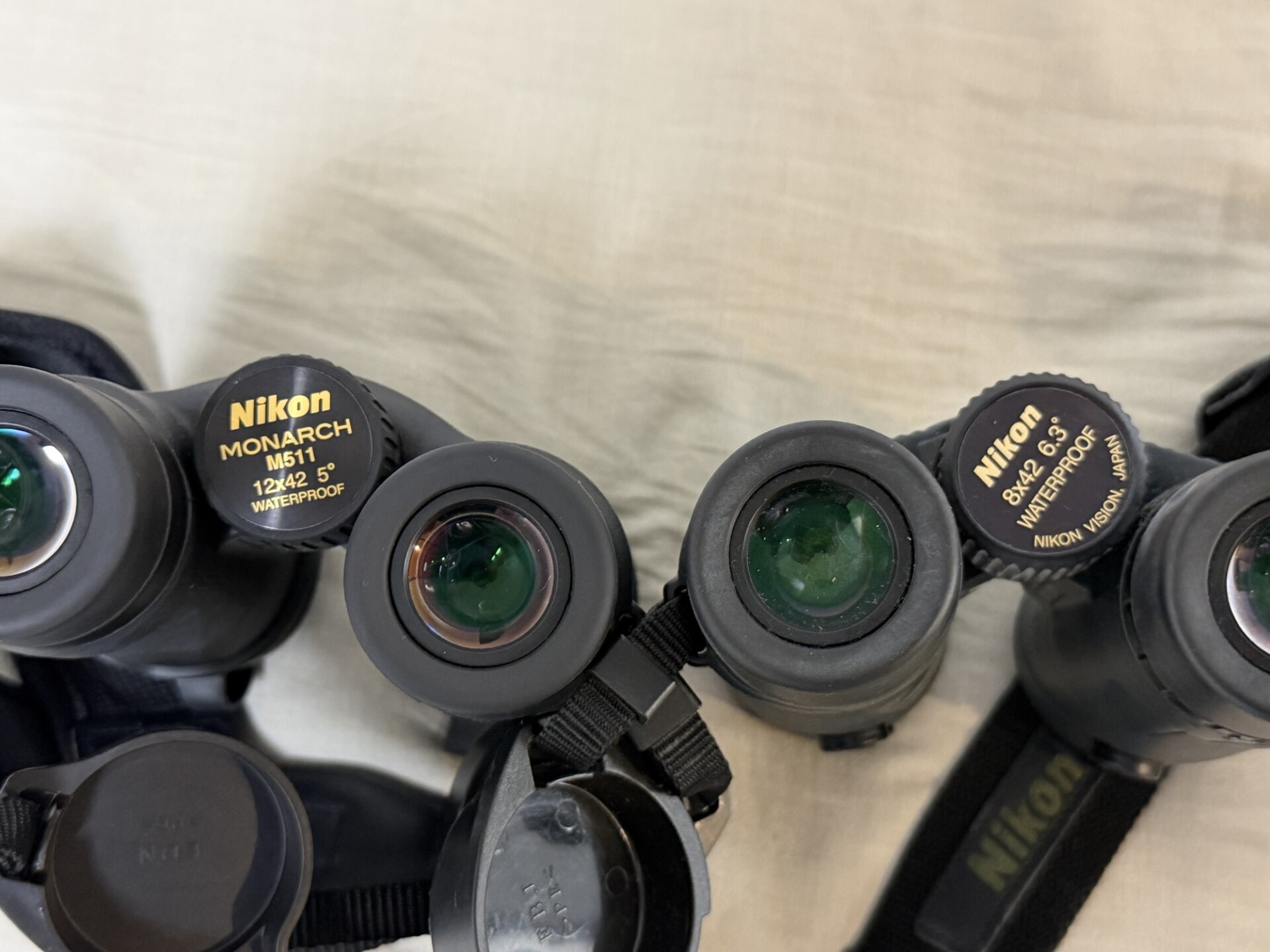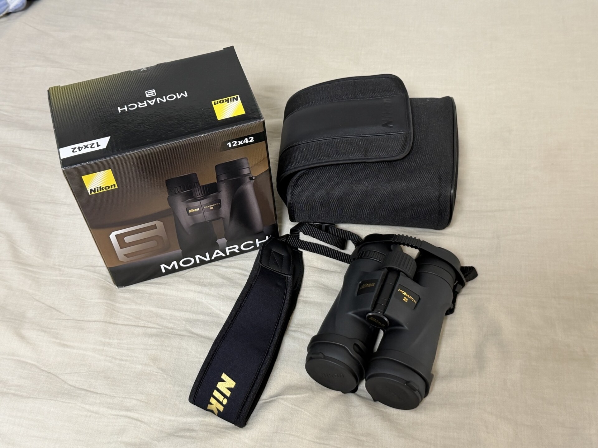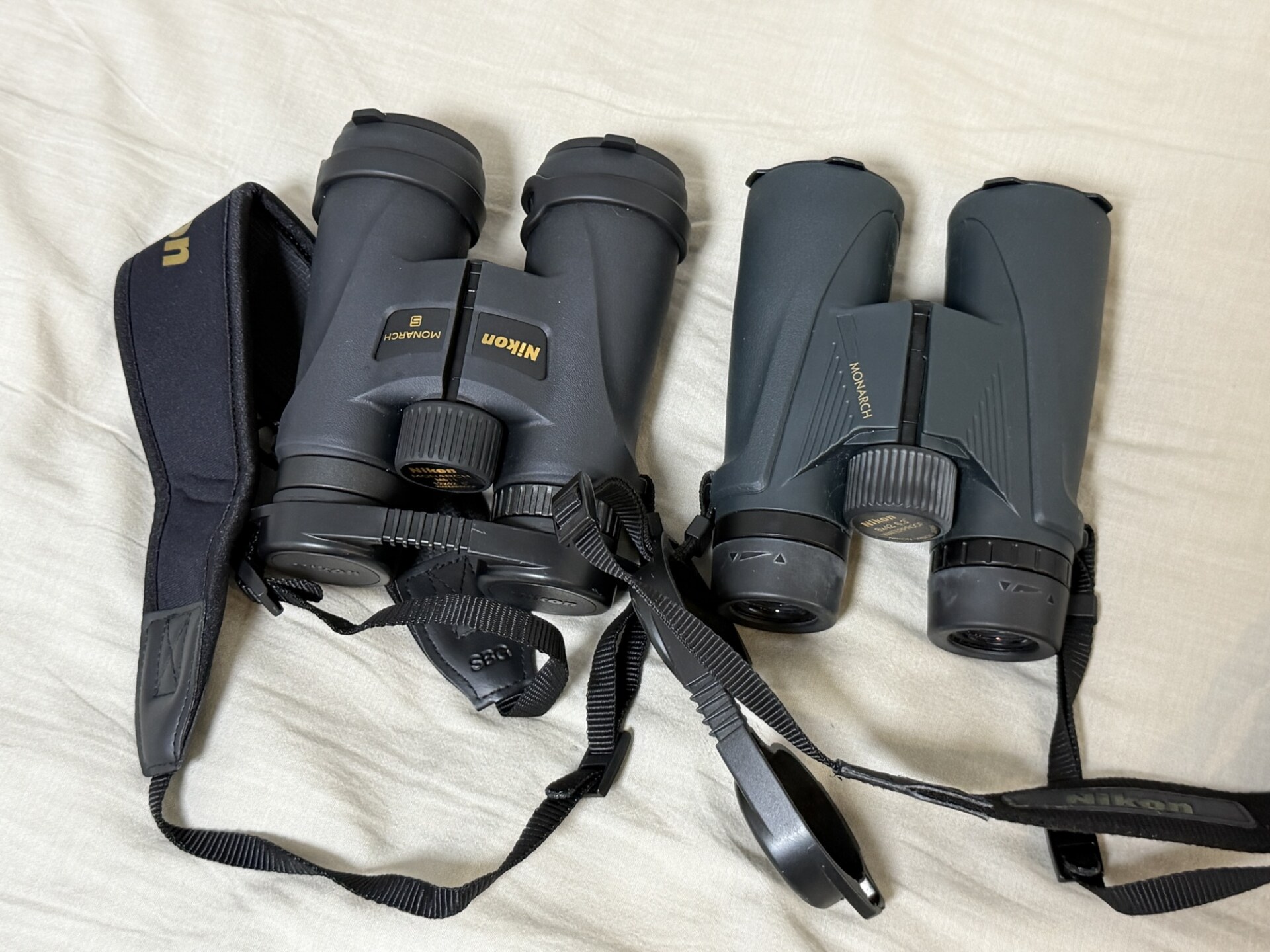 左が今回かったモナーク 5 12×42でして、右が長年愛用している古いモナーク 8×42です。ちょっとだけモナーク 5の方が本体が大柄ですね。モナークは中古で買ってから5年ほど愛用してまして、普段は防湿庫に保管しています。うちの防湿庫は双眼鏡しか置いてないです(笑)。
