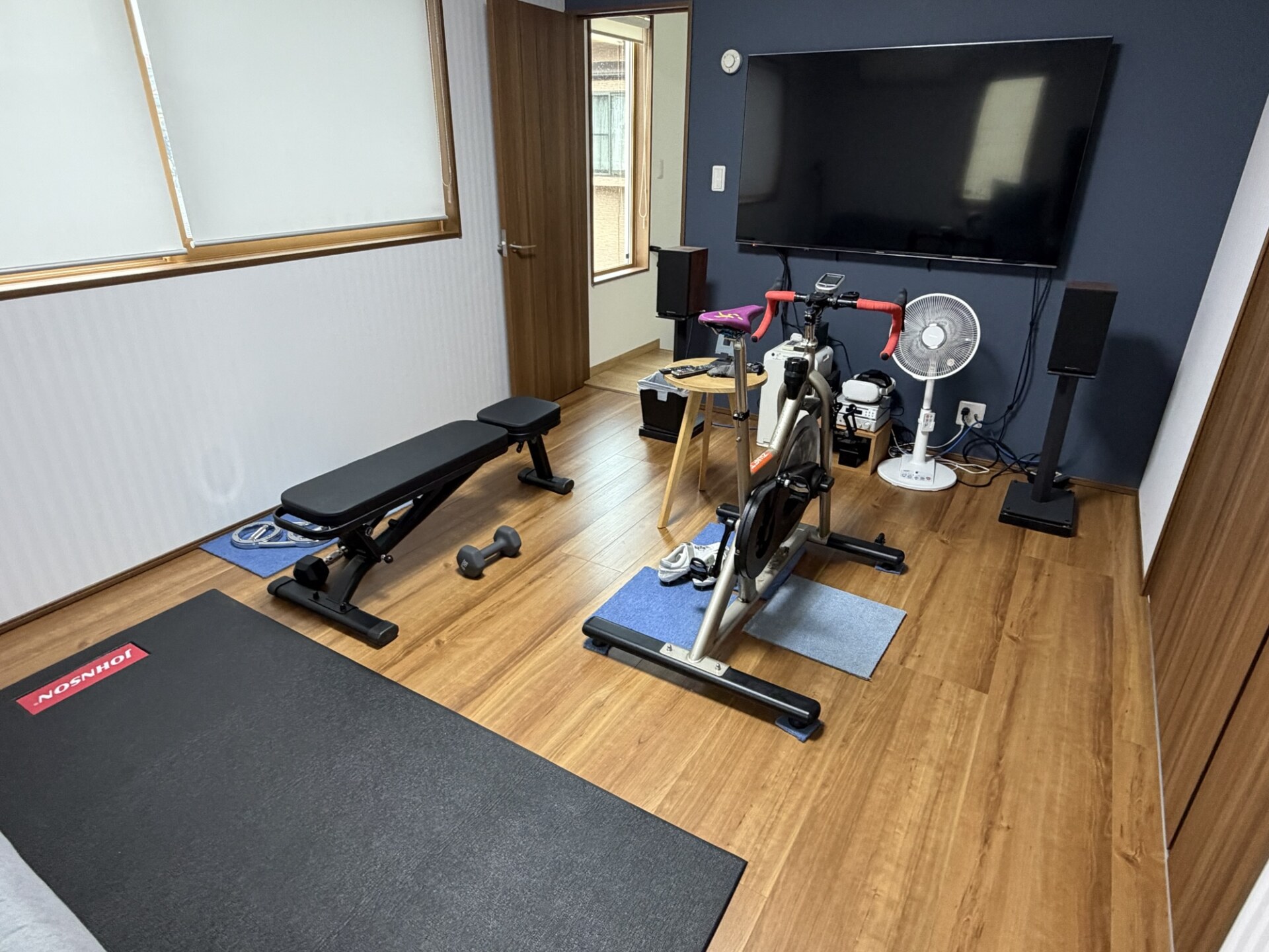 冬場に備えて、今週は空いている部屋をトレーニングルームに模様替えしました。先週、Amazonのセールで買ってしまったトレーニングベンチを設置し、ダンベルトレーニングをやります。またストレッチ用のマットを敷いて、股関節やら膝、足首のストレッチをやります。また動画を見ながらローラー台を回せるように、固定ローラーをTVの正面に移動しました。