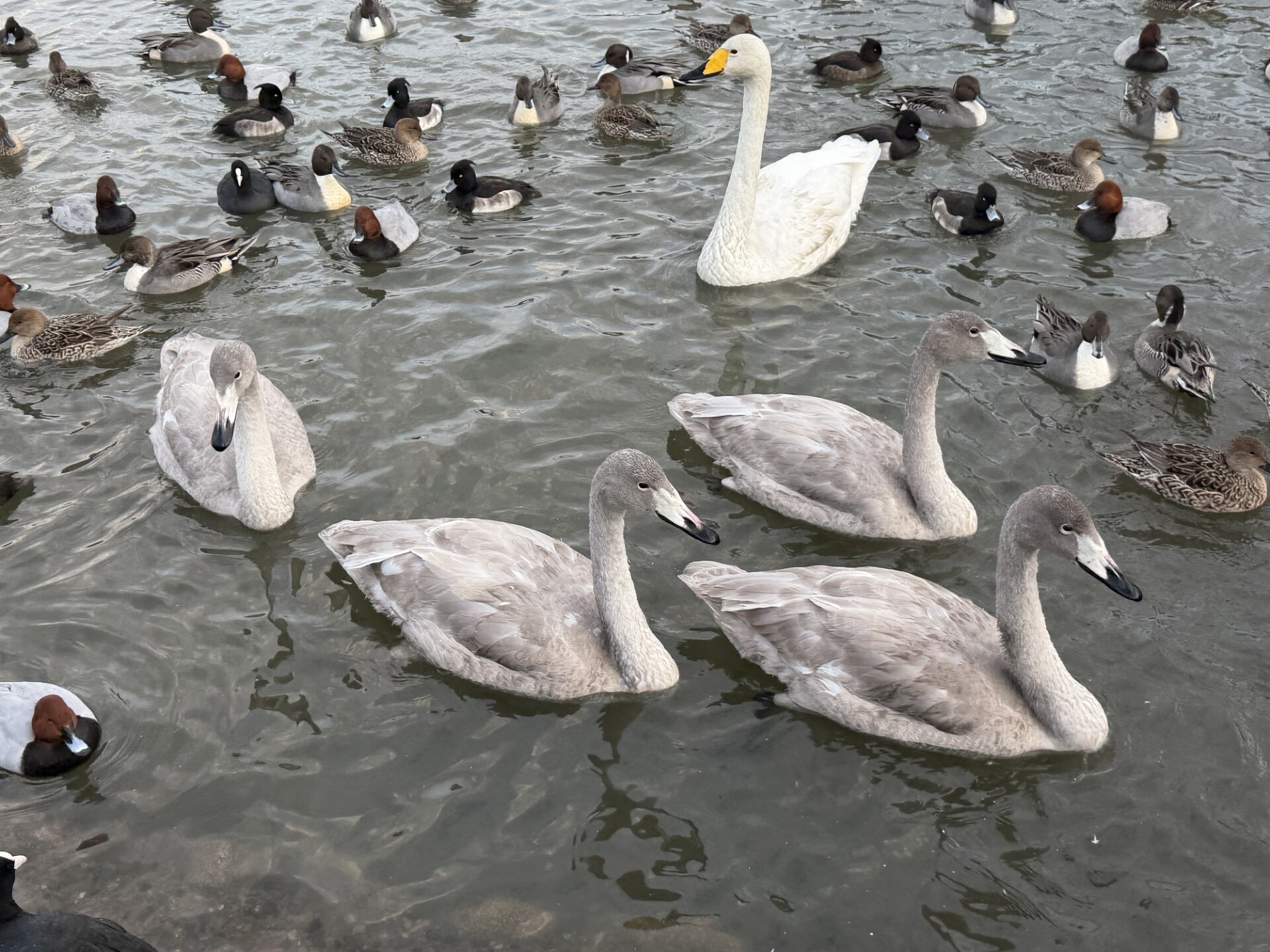 この4匹の幼鳥は人が来ると餌が貰えることを覚えているようで、湖面に近寄ると寄ってきます。今年の瓢湖は例年ぐらいのハクチョウが渡来していて、いまが一番が数が多いこともあって土日ともに観光客は多かったです。
