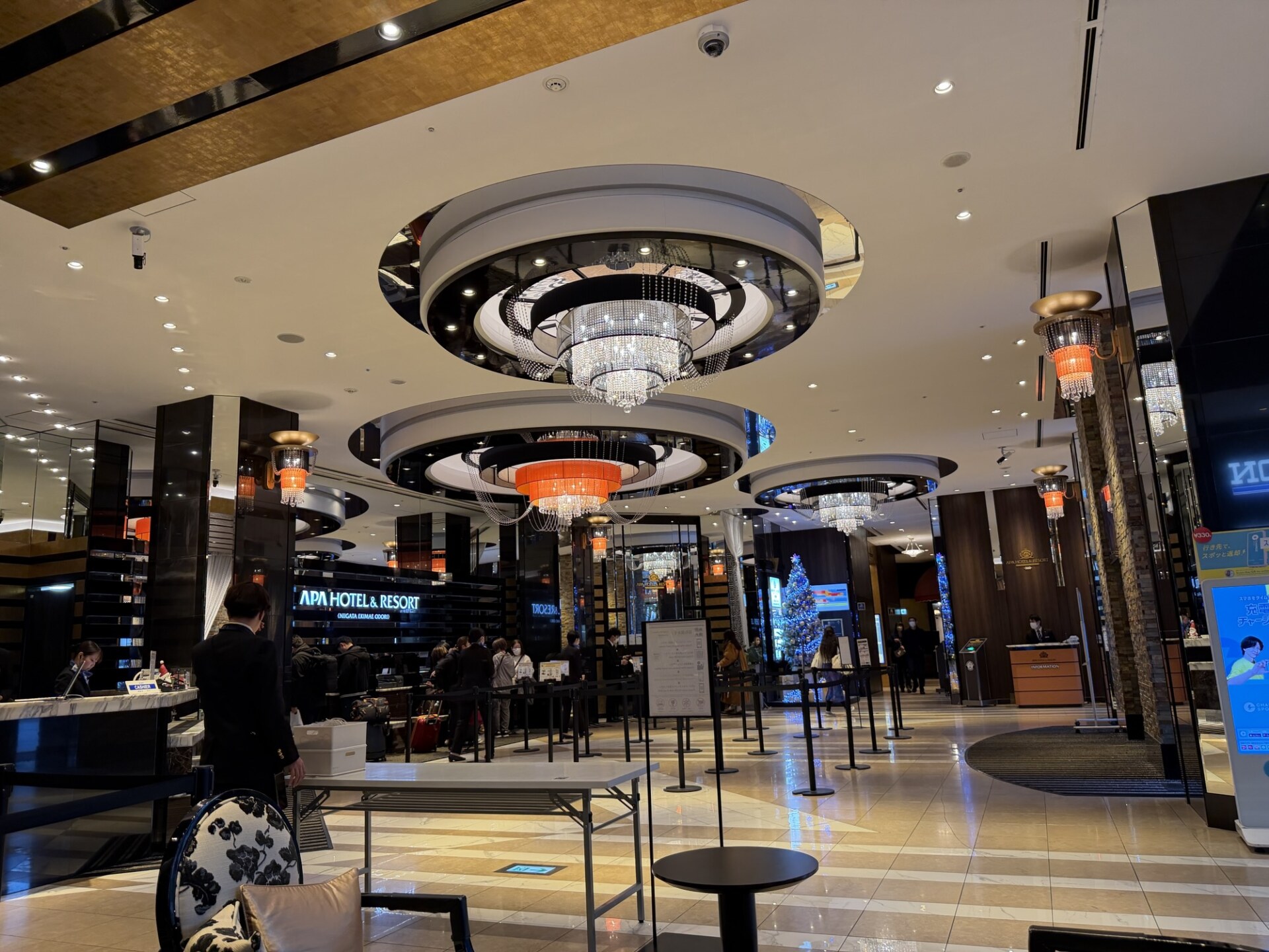 ロビーも豪華ですが、基本はアパホテルなので自動チェックイン機が受付のメインでして、チェックアウトもカード回収機にカードを投函するだけで終わりです。この辺は他のアパホテルと同じですし、エレベーターが混み合うのも同様です。なにせ部屋が19階まであります。