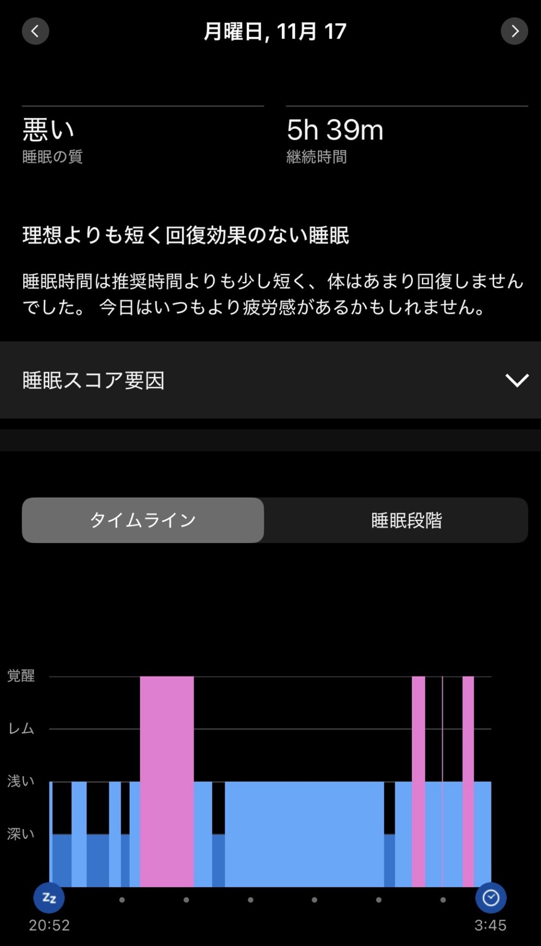 当日のGarminのスマートウォッチが計測した睡眠状態。途中覚醒が長くて、こんなに浅い眠りが続くのは珍しいです。アルコールを摂取すると眠りが浅くなると言いますが、その影響もあるのかな?