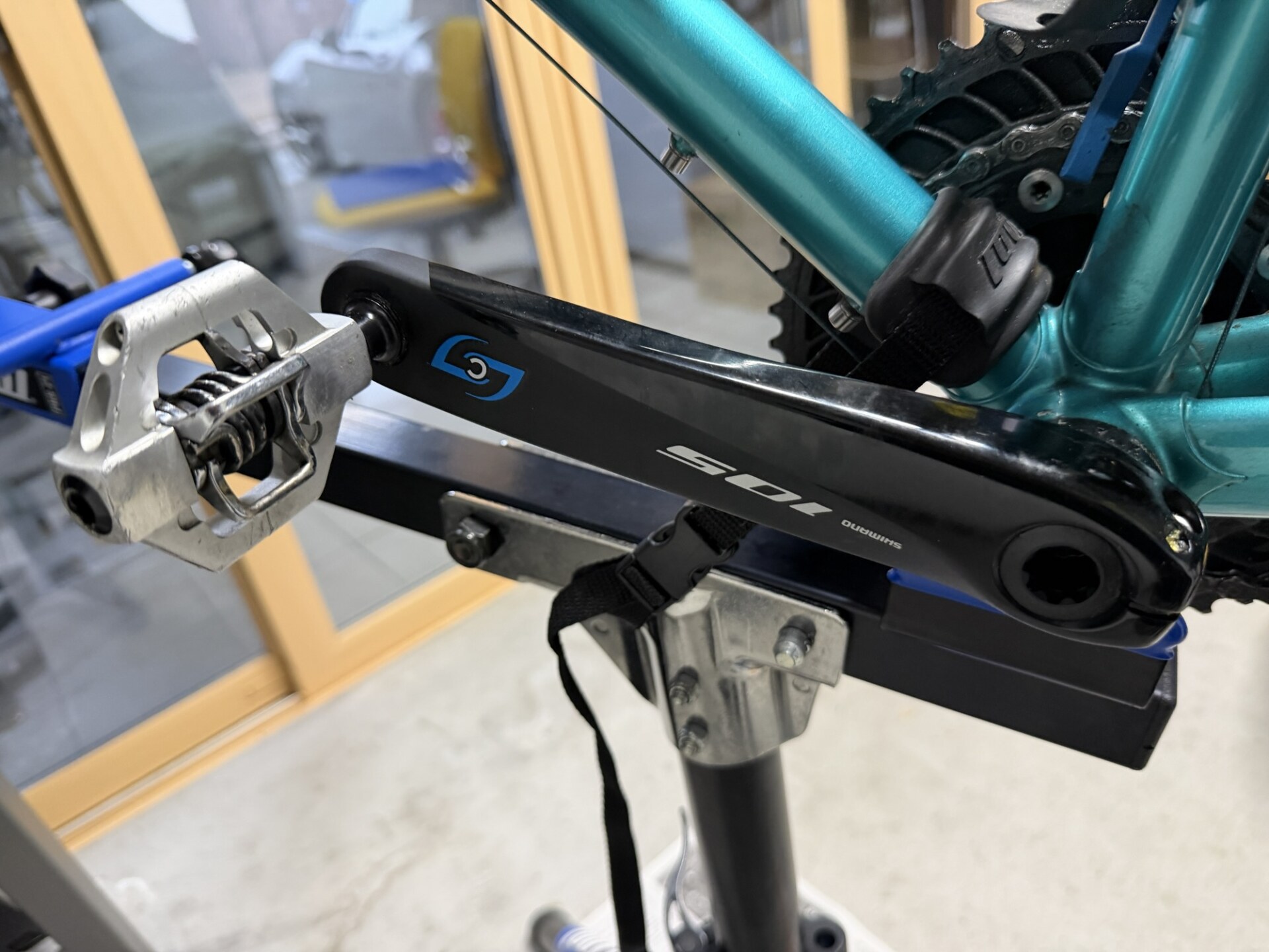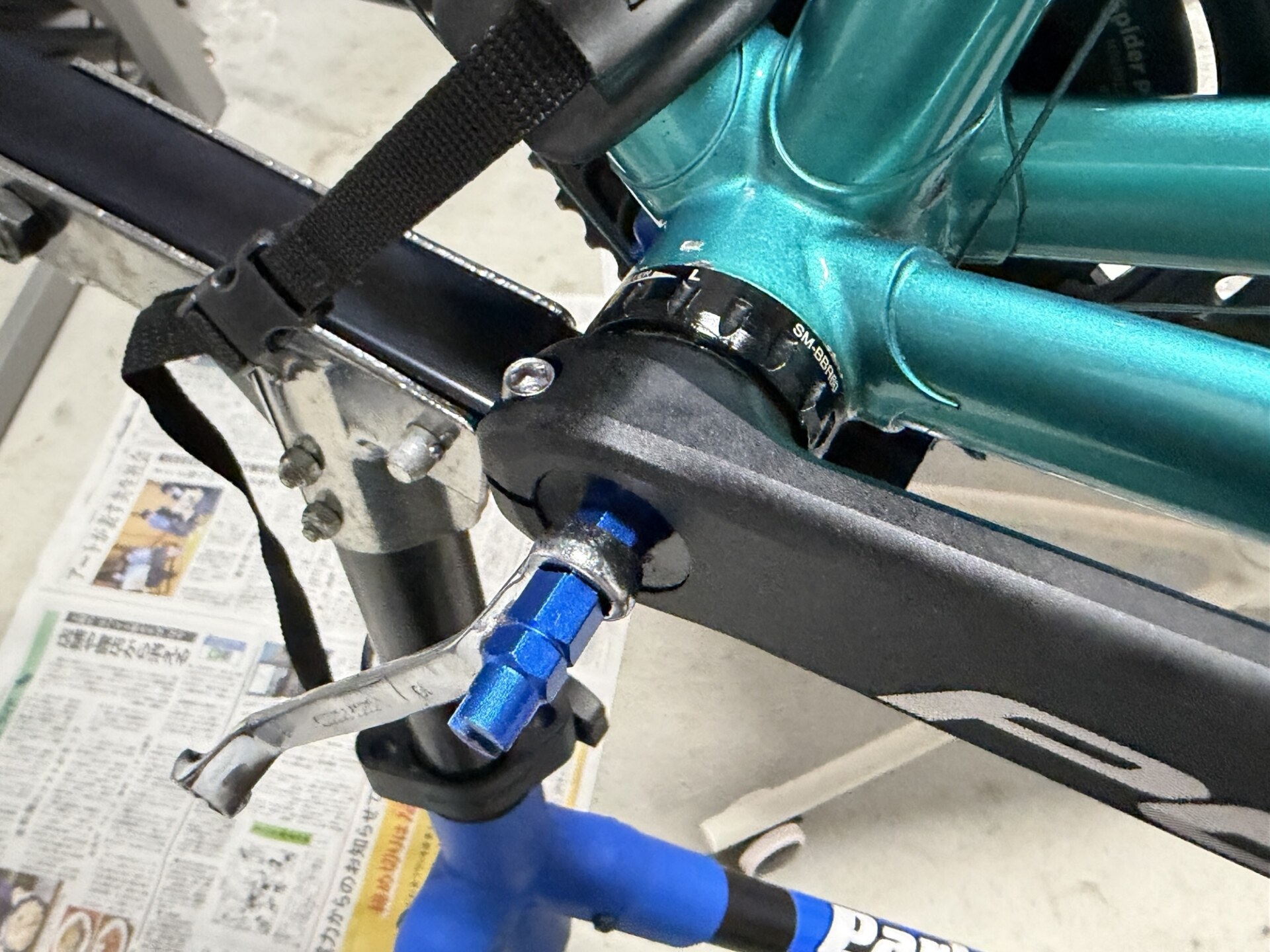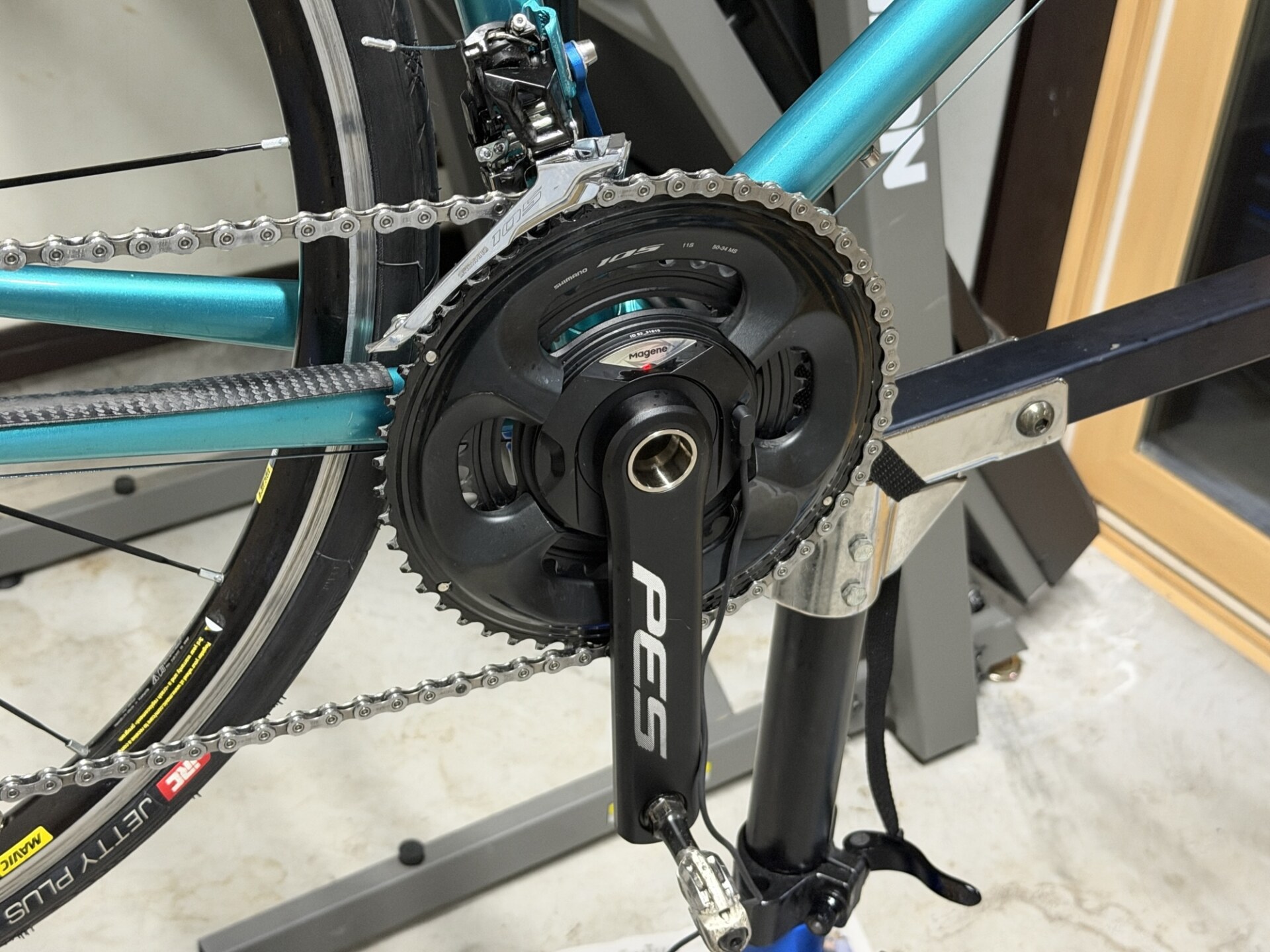 室内で使うからには、チェーンラインやチェーンリングに少し触っただけで汚れがつくことは避けたいです。なので、徹底的に洗浄するついでに、これまでマキノ号で使っていたパワーメーターを交換する作業も一緒に行いました。