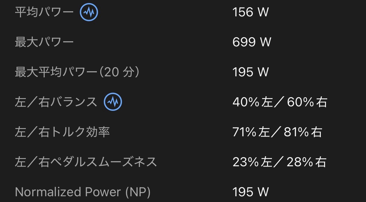 この値の精度がいまのところ怪しいと思っています。パワー値は信頼できそうなんですが、左右の差の値については明らかに揃いすぎています。自分はこんなに綺麗にペダリングは出来ません。