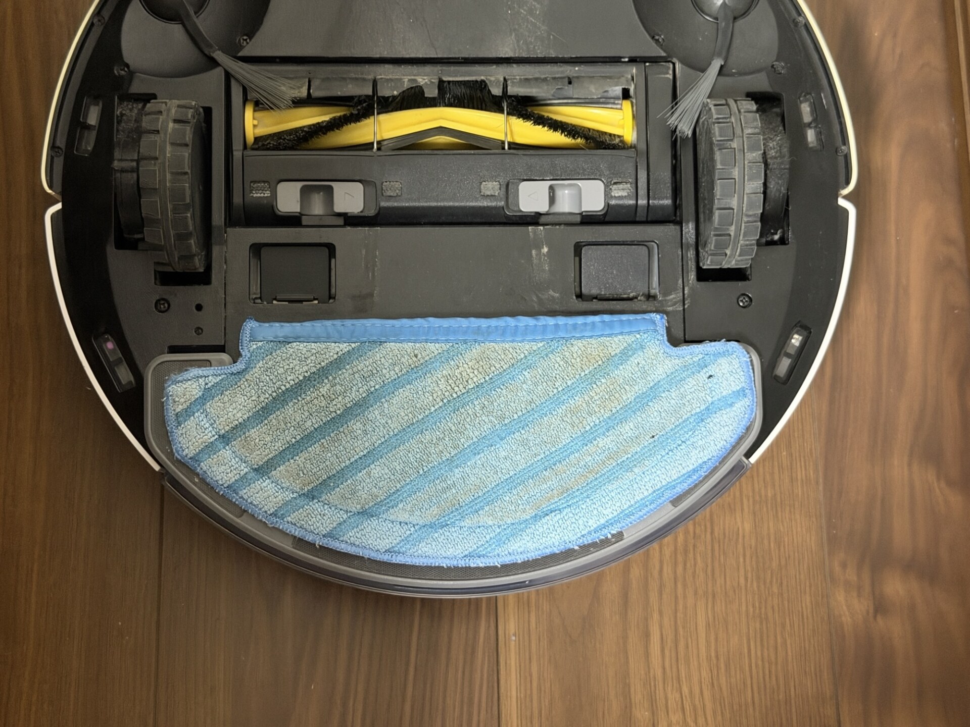 ちなみに、これまで使っていた N8+ のモップ機能はこうしたものです。モッププレートにマジックテープで専用モップを取り付け、タンクに水を入れておきます。あとは掃除機がゴミを吸いながら動くときにモップに水が供給され、軽く床の表面を濡らしたモップが雑巾がけしてくれます。