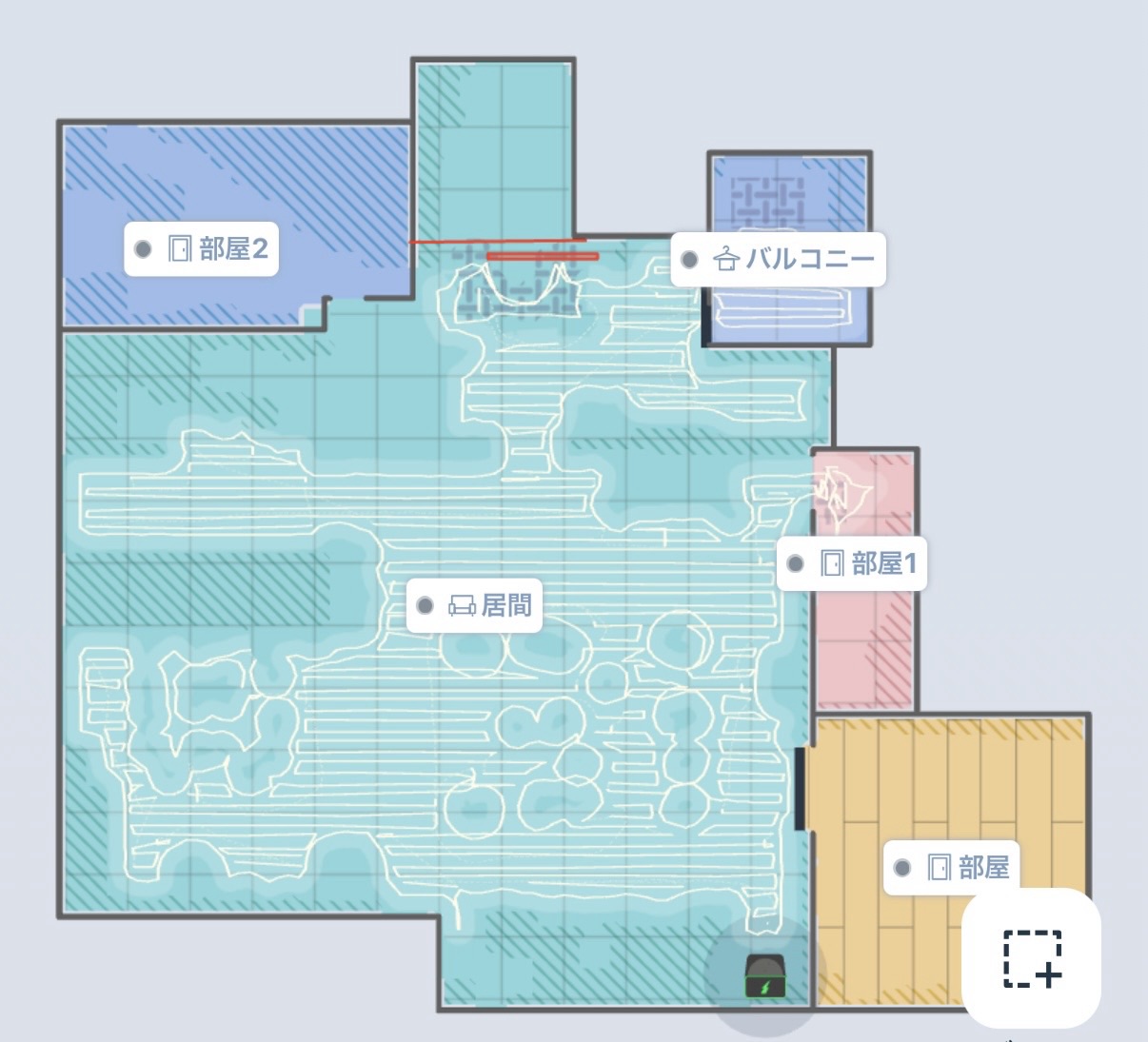 開梱してリビングの定位置にロボット掃除機を設置し、一度動かして部屋の形を学習させます。カメラの解像度が上がっているようで、以前よりも部屋の形を認識する能力が上がっていますね。入ってほしくない場所に仕切り線を入れたり、モップ掛けしたくないカーペットやマットを指定すれば完了です。