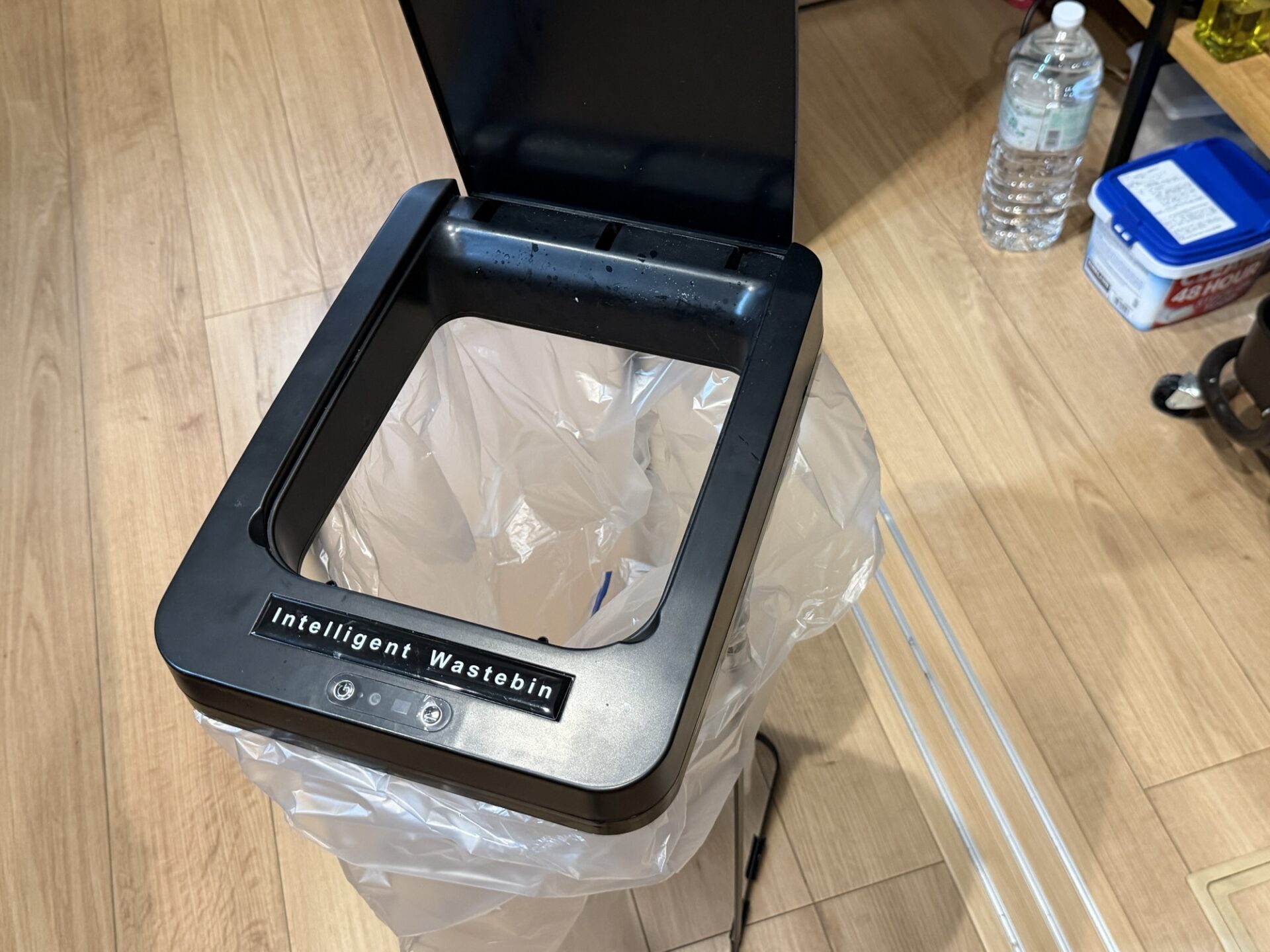 このごみ袋ホルダーですが、センサーがついていて手をかざすと蓋が開閉します。我が屋はメインの燃えるゴミのゴミ箱もセンサーで開くタイプのものを使っていて、一度使うと便利で手放せません。このゴミ箱のセンサーはやや敏感すぎて、動作もバタンバタンとうるさい感じなのが残念ですが、他にこういう製品がなかったので便利に使っています。