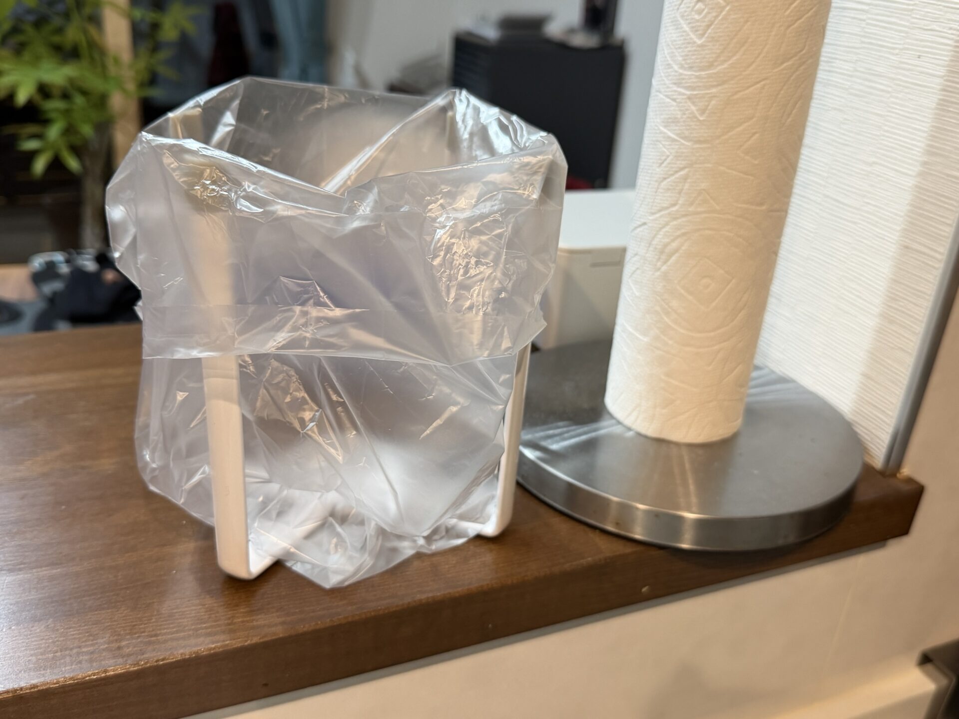 四隅がポリ袋が引っかかりやすいゴムになっているので、軽く被せただけのアイラップがズレることもなく、安心してゴミを入れることが出来ます。主にコーヒー豆のカス、野菜の皮等の生ゴミなどを入れて、ある程度一杯になったら、シンクにおいてある水切り袋を入れて袋を閉じて、ゴミ箱行きです。