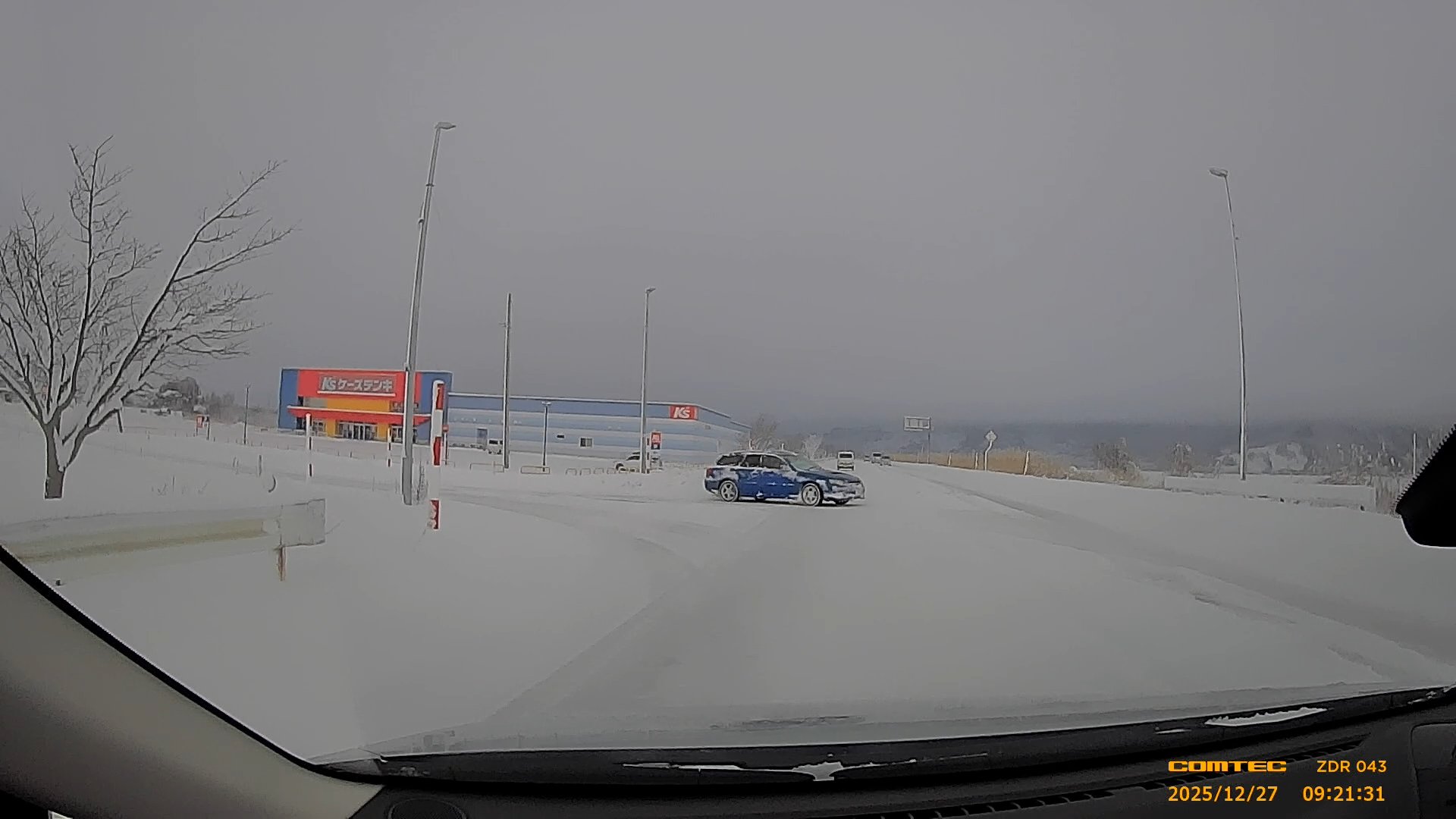 イガランダーさんがハンドルを握っていたのですが、さすが新潟での雪道運転は私よりも上手なので、ブレーキを掛けつつ、間に合わないと判断して左の側道に逃れました。タイヤは今シーズンに投入した新品のVRX3でしたので、グリップを失うこともなく衝突は回避出来ました。