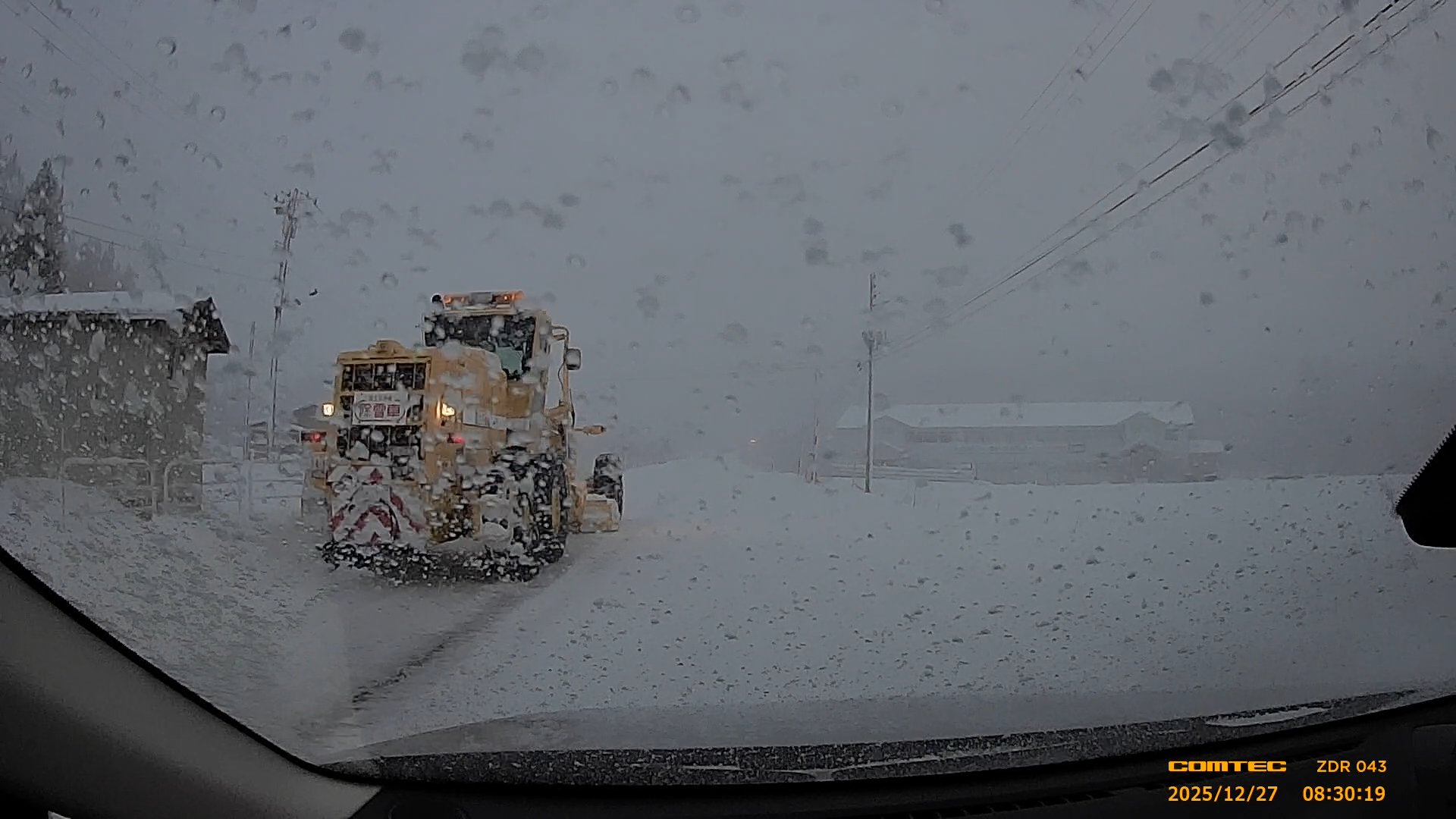 しかし、走っている除雪車の台数も多く、追いついたら追い越しをしないといけません。対向車が来ないタイミングになると除雪車がウインカーで教えてくれるので、それを合図に追い抜きします。