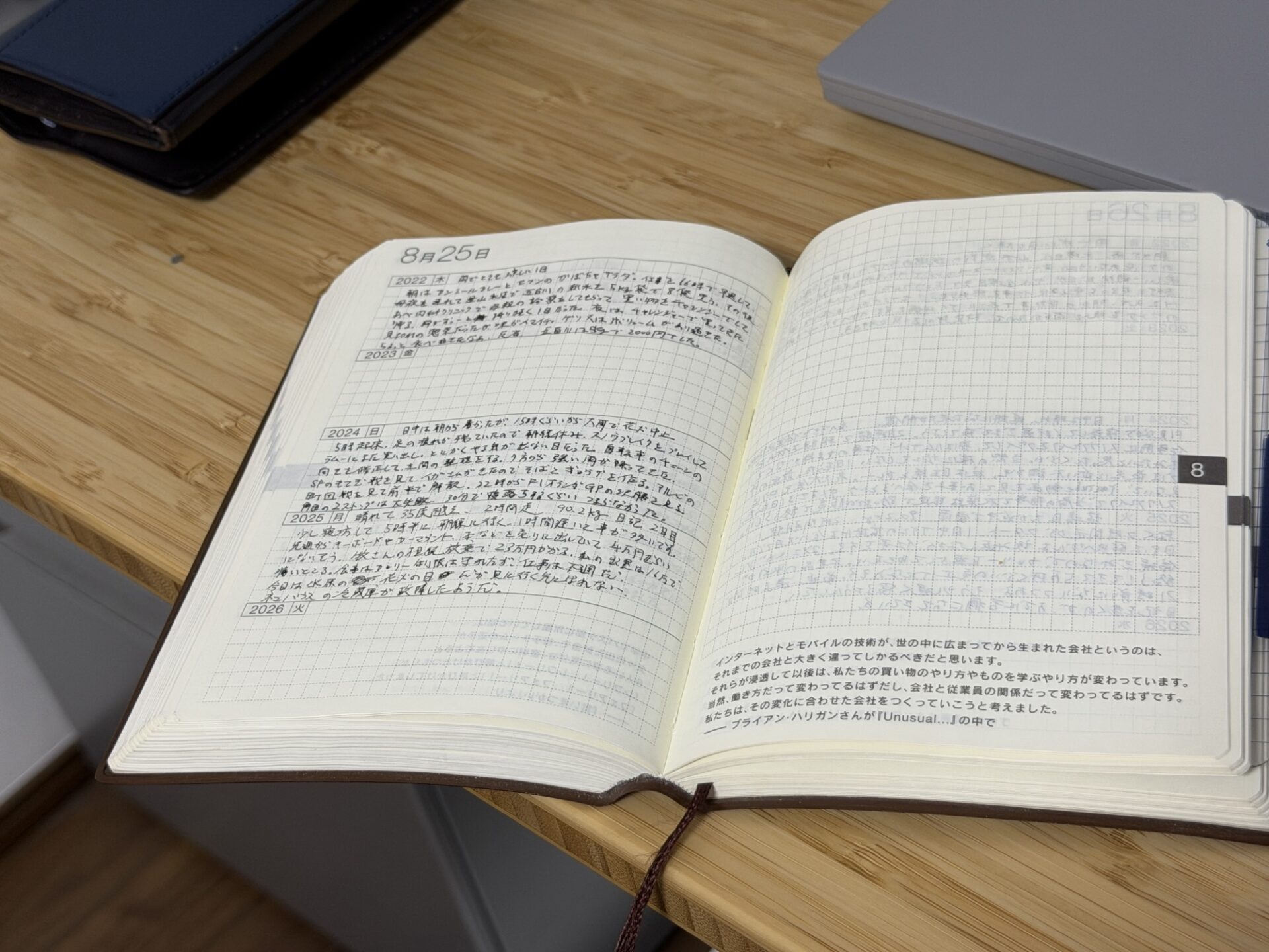 自分はとにかく記録を残すのが好きで、ブログの更新頻度が低かった2022年あたりは紙の日記に起きた出来事を記録していました。使っていたのは「ほぼ日5年手帳」の小さい方のA6サイズです。2022年には気にならなかった書くスペースの小ささですが、老眼が進んで最近は小さい文字を書くのが苦痛です。