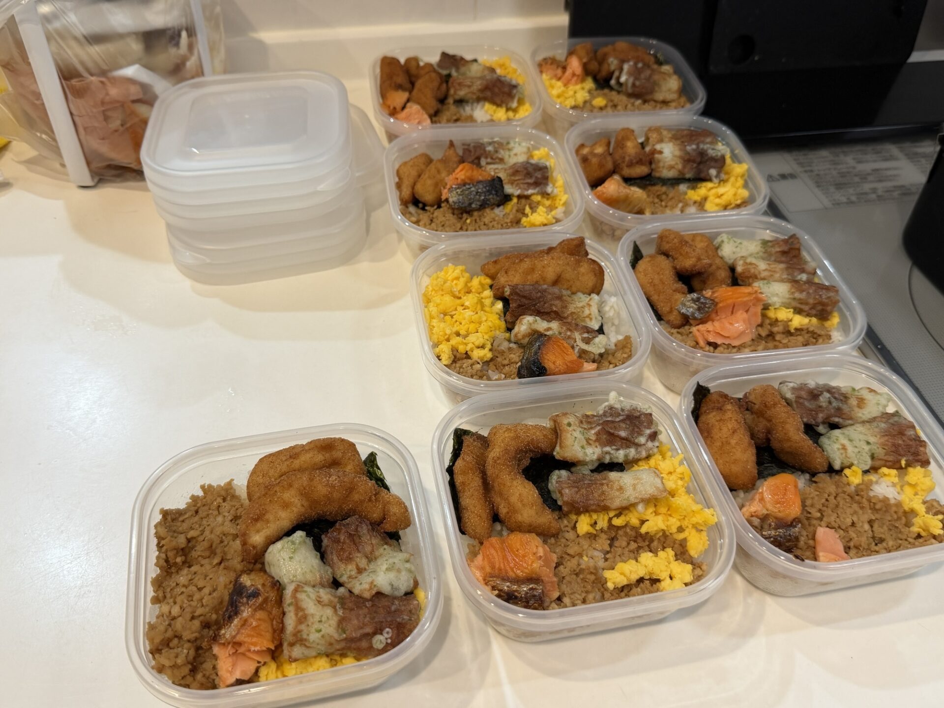 ご飯150gの上に鶏そぼろ、炒り卵、ちくわの磯辺揚げ、ささみの唐揚げ、焼鮭などを載せた小さな弁当を作り置きします。これは冷凍して、そのままレンジでチンするだけで食べられます。「かっちゃんねる」というレシピ系YouTuberのお得意メニューなのですが、自分はかなり参考にしています。