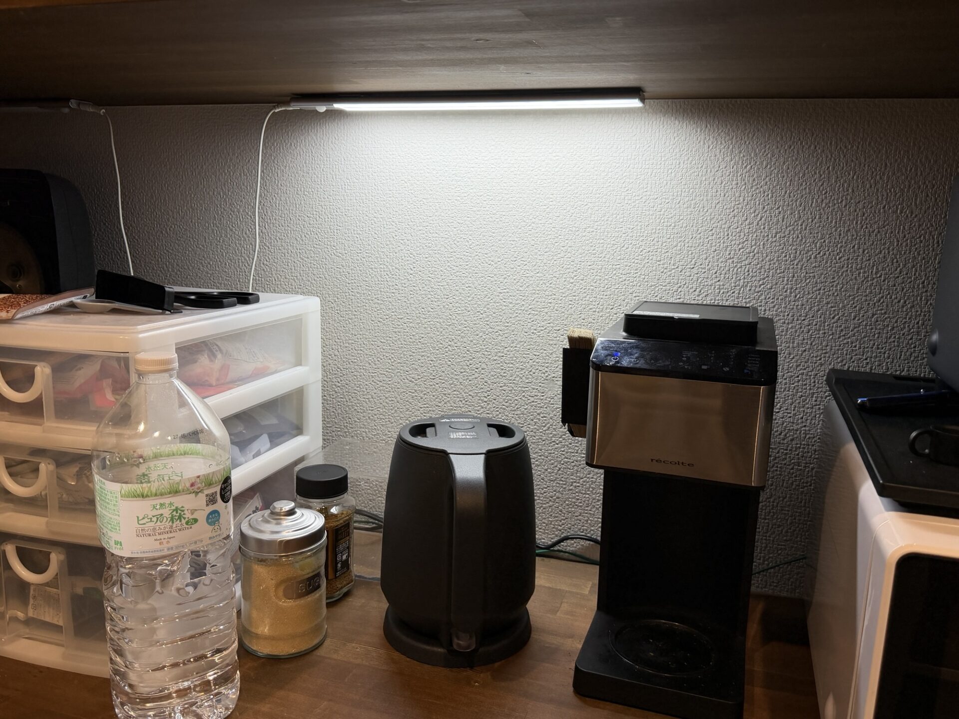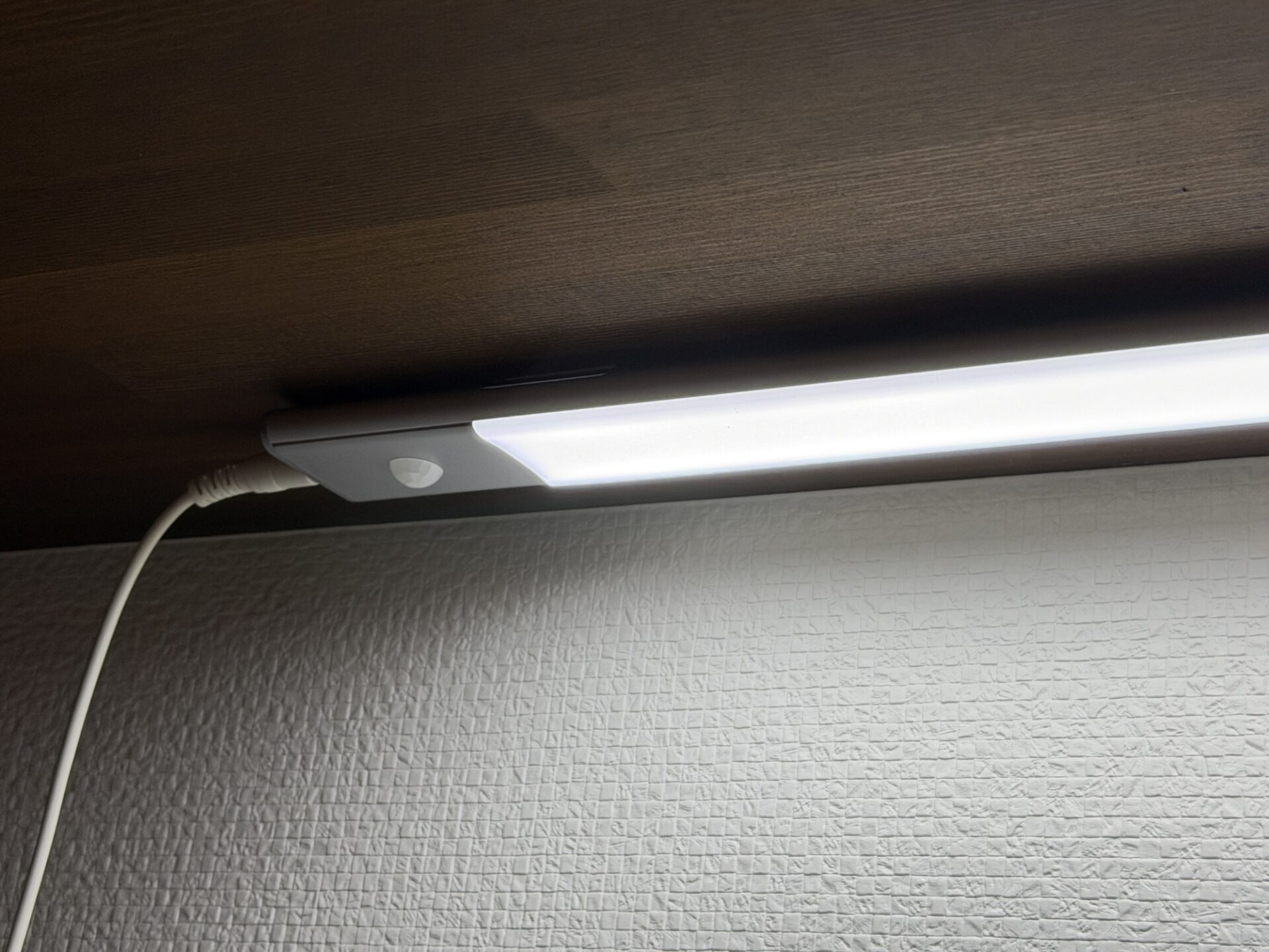 パントリーの一番下の棚はキッチン家電などを置いているスペースなので、ここに人感センサーを備えたLEDライトを2つ取り付けてます。2020年の移住時にAmazonで購入したのですが、確か1本2000円ぐらいだったかな。2020年ごろの私は過剰に予備を買う、という悪い癖がありまして、この時も故障に備えて予備を購入していました。