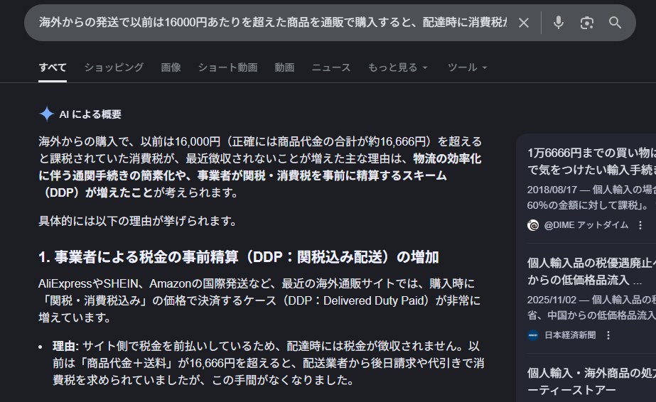 海外からの購入で、以前は16,000円(正確には商品代金の合計が約16,666円)を超えると課税されていた消費税が、最近徴収されないことが増えた主な理由は、物流の効率化に伴う通関手続きの簡素化や、事業者が関税・消費税を事前に精算するスキーム(DDP)が増えたことが考えられます。
