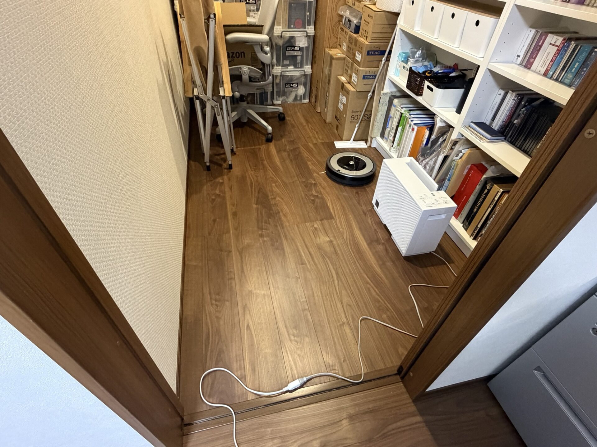 パワーマジックマグプラスは分解して、二階のトレーニングルームから物置に移動しましたが、これが重くて一人では階段を下ろすのに一苦労しました。この部屋にはトレーニングベンチや可変ダンベルも置いているので、少しでも整理したかったんです。おかげで部屋も広くなりましたし、ロボット掃除機も運用しやすくなりました。
