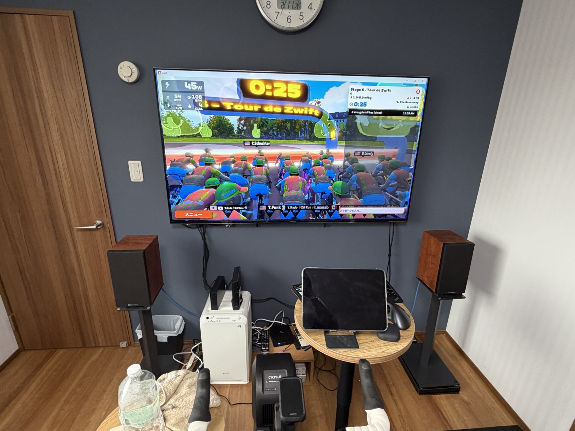 そそくさと着替えてローラー台をセットアップして、12時ジャストにスタートです。脚が合う人4人ぐらいと一緒に走り、1時間12分で完走です。この前のステージのロングコースに比べると楽ちんでした、というか、この前走ったコースがイベント内でおそらく一番きついコースだったと思います。