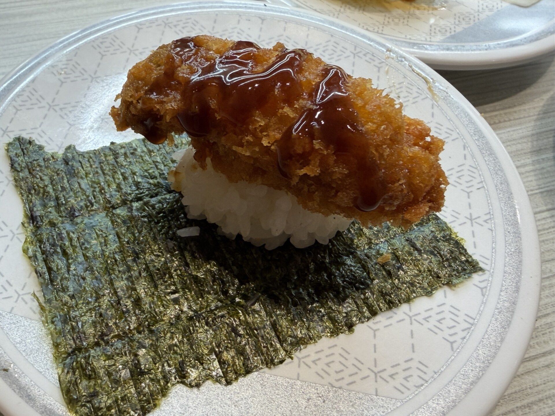 期間限定のカキフライ握りもいただきます。海苔が美味しゅうございました。これは1貫でも満足感がありますね。写真を撮り忘れましたが、アスパラ天握りも非常に美味しかったです。「はま寿司」は揚げ物が美味しいという異端の回転寿司だと思います。