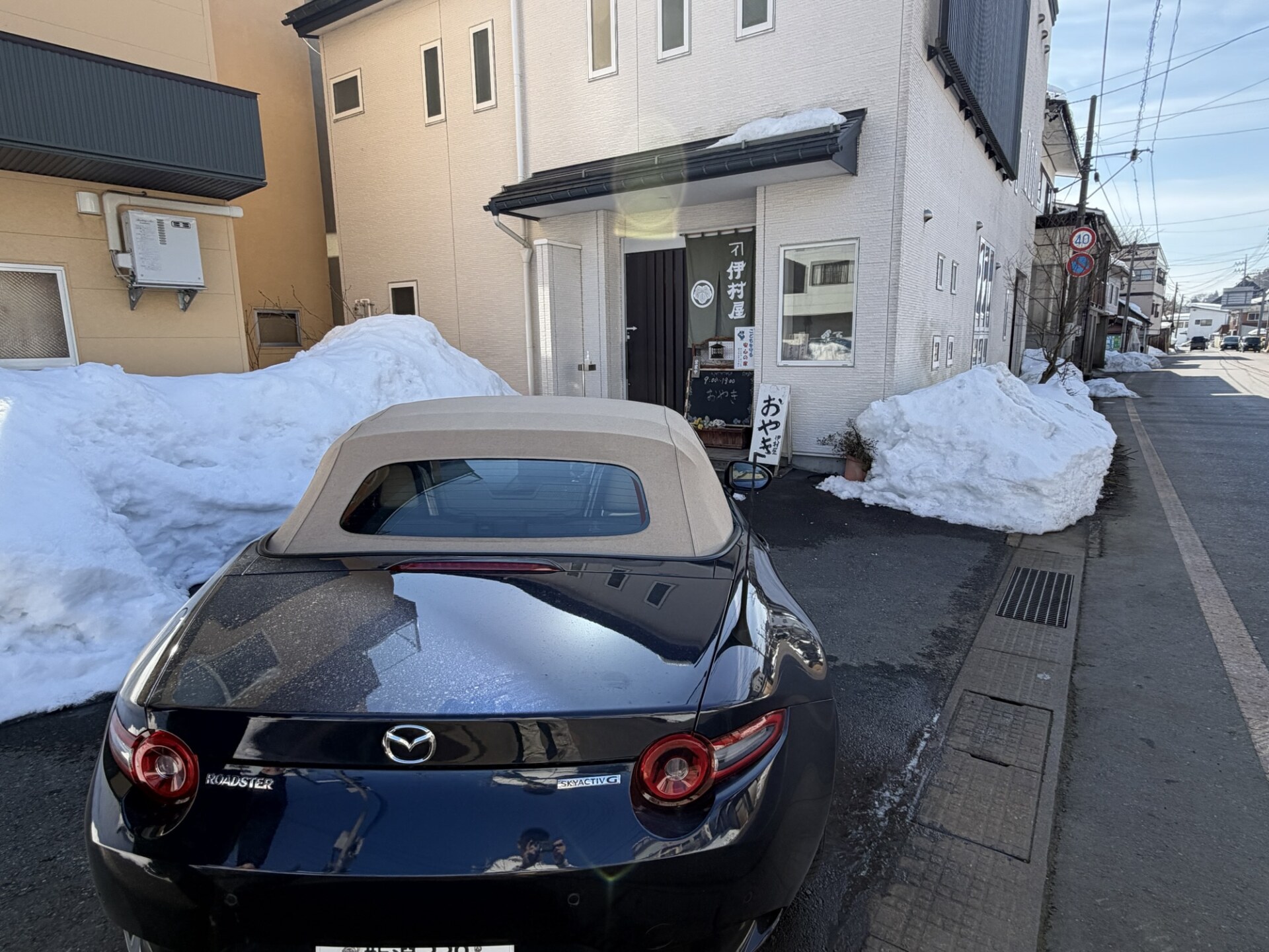 お店の駐車場には雪の山がありまして車は1台しか駐められませんでしたが、運よく駐めることが出来ました。写真を取るときは下車するタイミングなので幌をしてますが、走っているときは幌オープンにしているので、お店は探しやすいです。