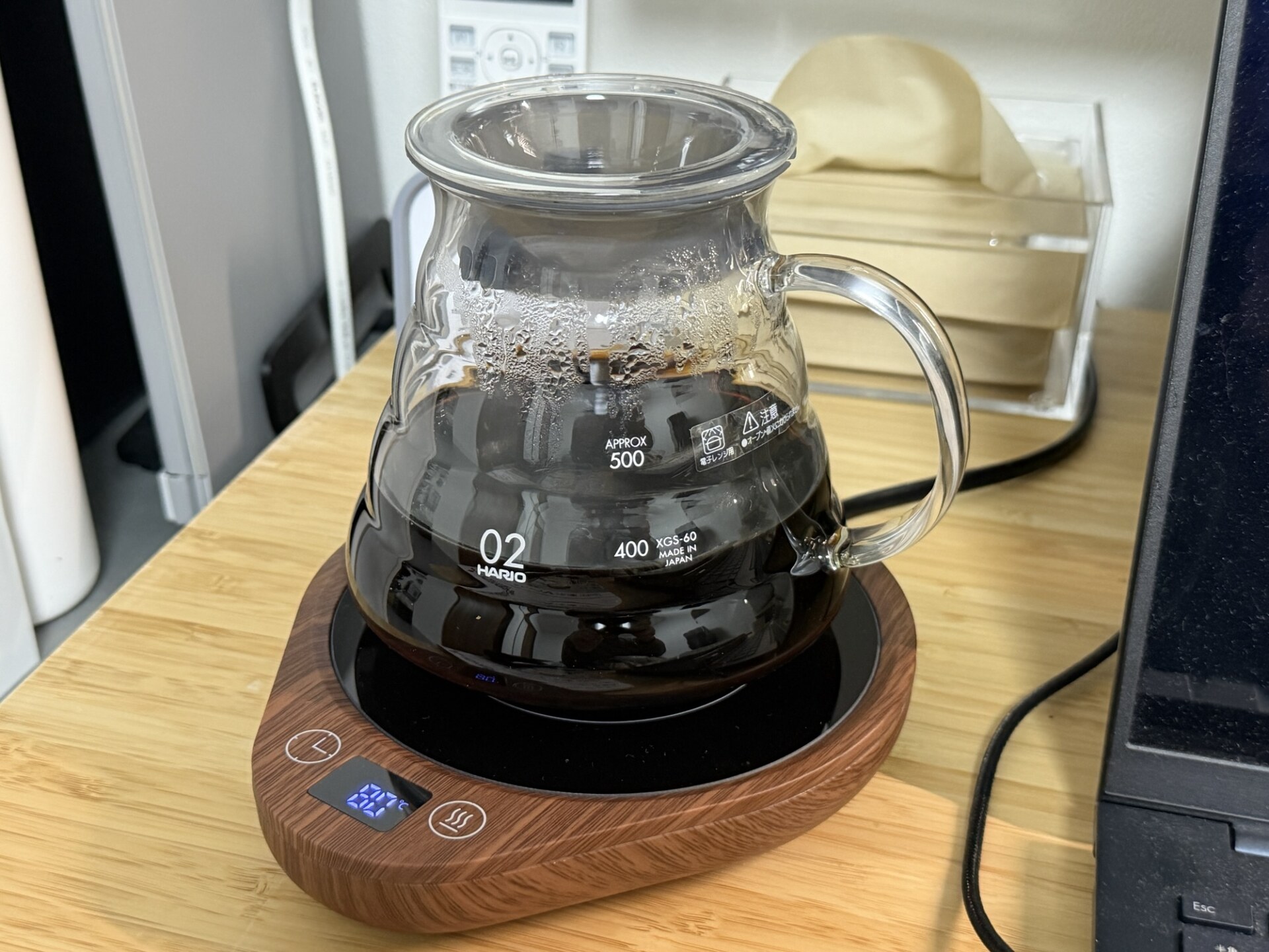 仕事部屋にはガラスサーバーのまま持っていって、カップウォーマーで保温します。「みるっこ」の導入に合わせて3000円ぐらいのカップウォーマーを導入したのですが、これは実に良いですね。もっと早く導入すればよかったです。これまではステンレス製の保温マグでコーヒーを飲んでいたのですが、やはり陶器のコーヒーカップで飲んだほうが美味しいです。