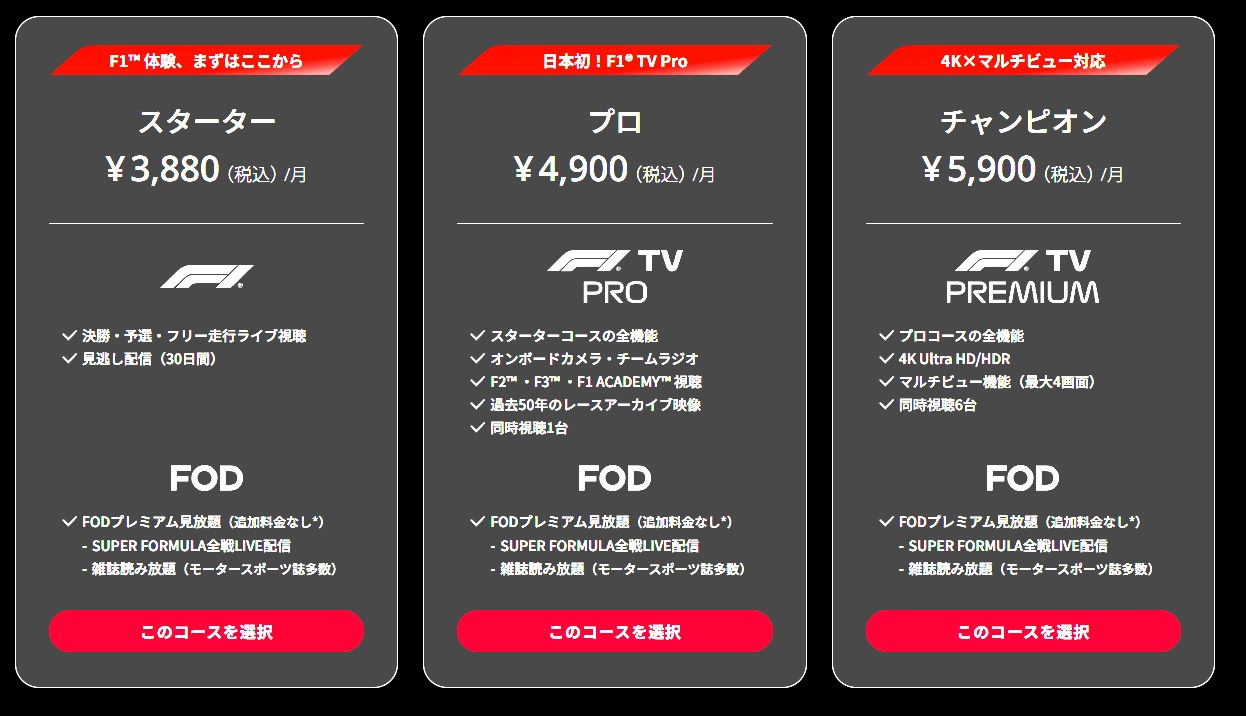 FODで契約することにしたのですが、どのコースにするのか?をちょっと悩みます。どれを選んだとしても、DAZNを継続契約していたときよりも月額では高くなります。AIに相談したところ、コースの変更には一度プランを解約しないといけないらしいです。今年はF1 TVを試してみたい気持ちがあったので「プロ」で申し込みました。