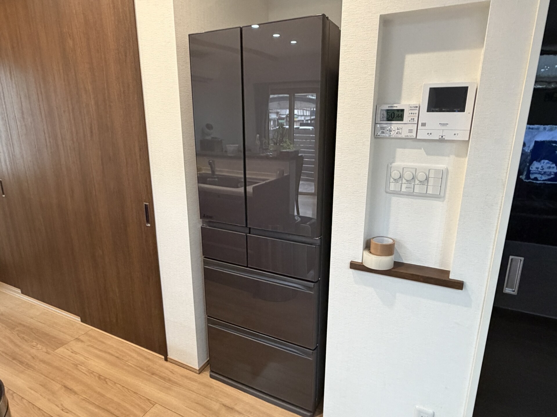日立の鋼板ドアのモデルより、ガラスドアの方が丈夫で綺麗です。ドア外装部にタッチパネルに触ると操作パネルが表示され、設定が点灯して綺麗です。現行の日立のモデルは、庫内のドアの裏に操作ボタン+LEDインジケーターの設定パネルがあるのですが、これが非常に安っぽくて幻滅してました。