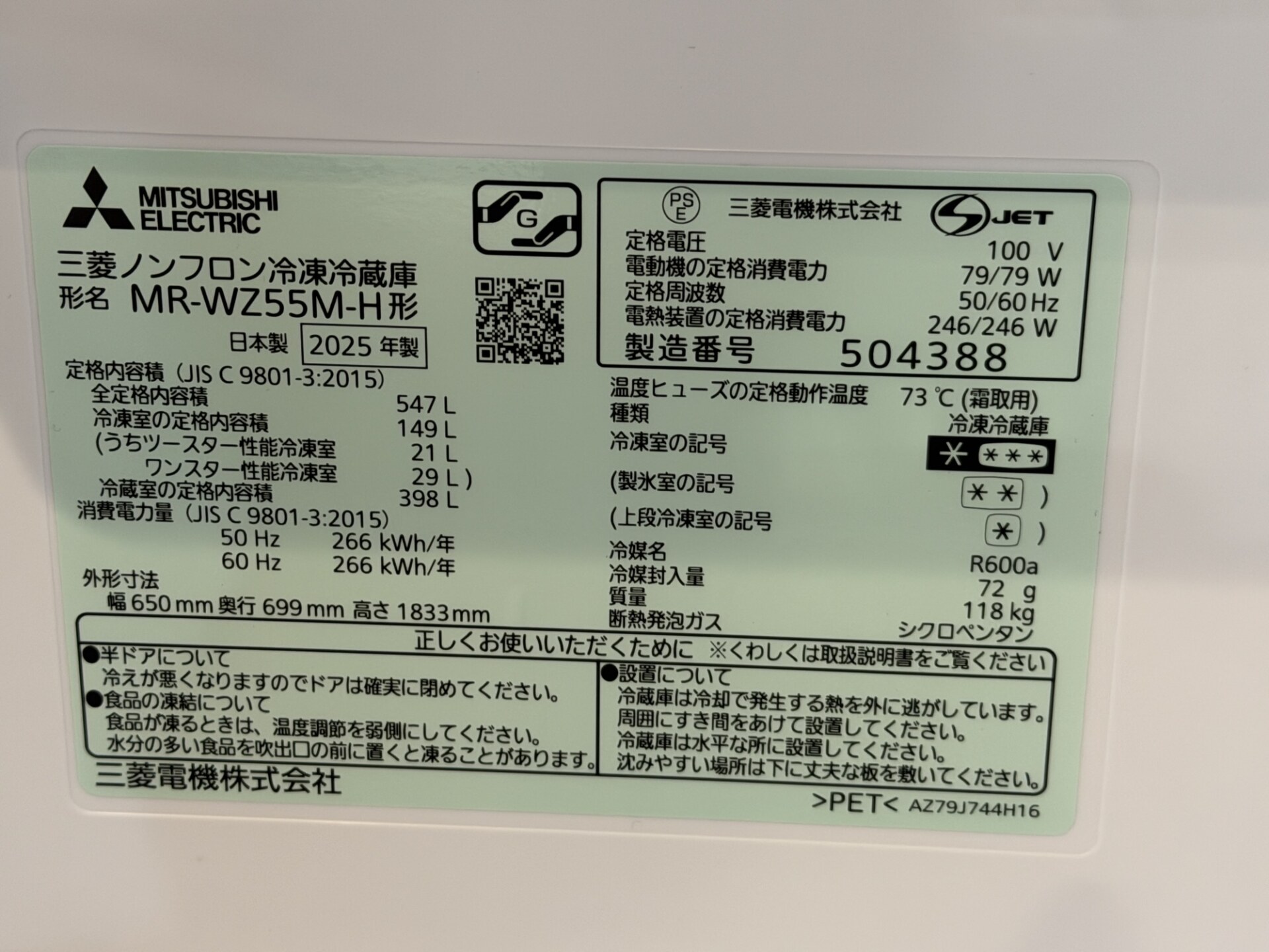 前回の以下の記事の続きです。Amazonに冷蔵庫を返送し(返金処理はまだ終わってない)、ヨドバシカメラで購入した三菱電機のMR-WZ55M-Hが金曜日の午後に届きました。