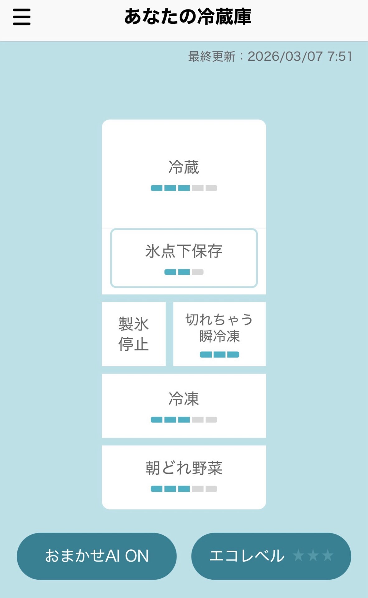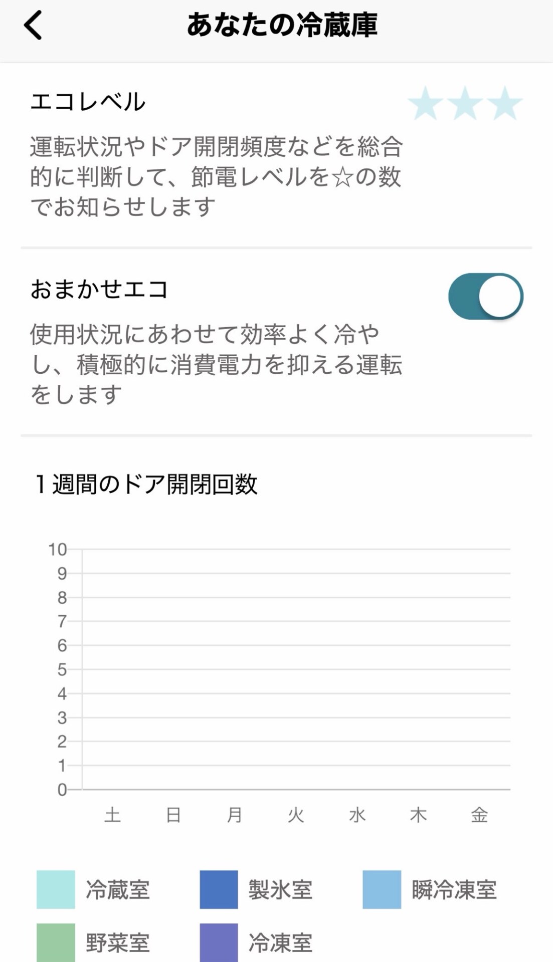 スマホアプリでは、各部屋ごとの冷却状態などを確認できます。三菱電機の冷蔵庫は各冷蔵・冷凍室ごとに細かく制御することで省エネを実現しているそうで、そのセンサー情報をアプリで見せているのでしょう。まだ電源を入れて1日も経過していないので、エコレベルは未評価の状態でした。