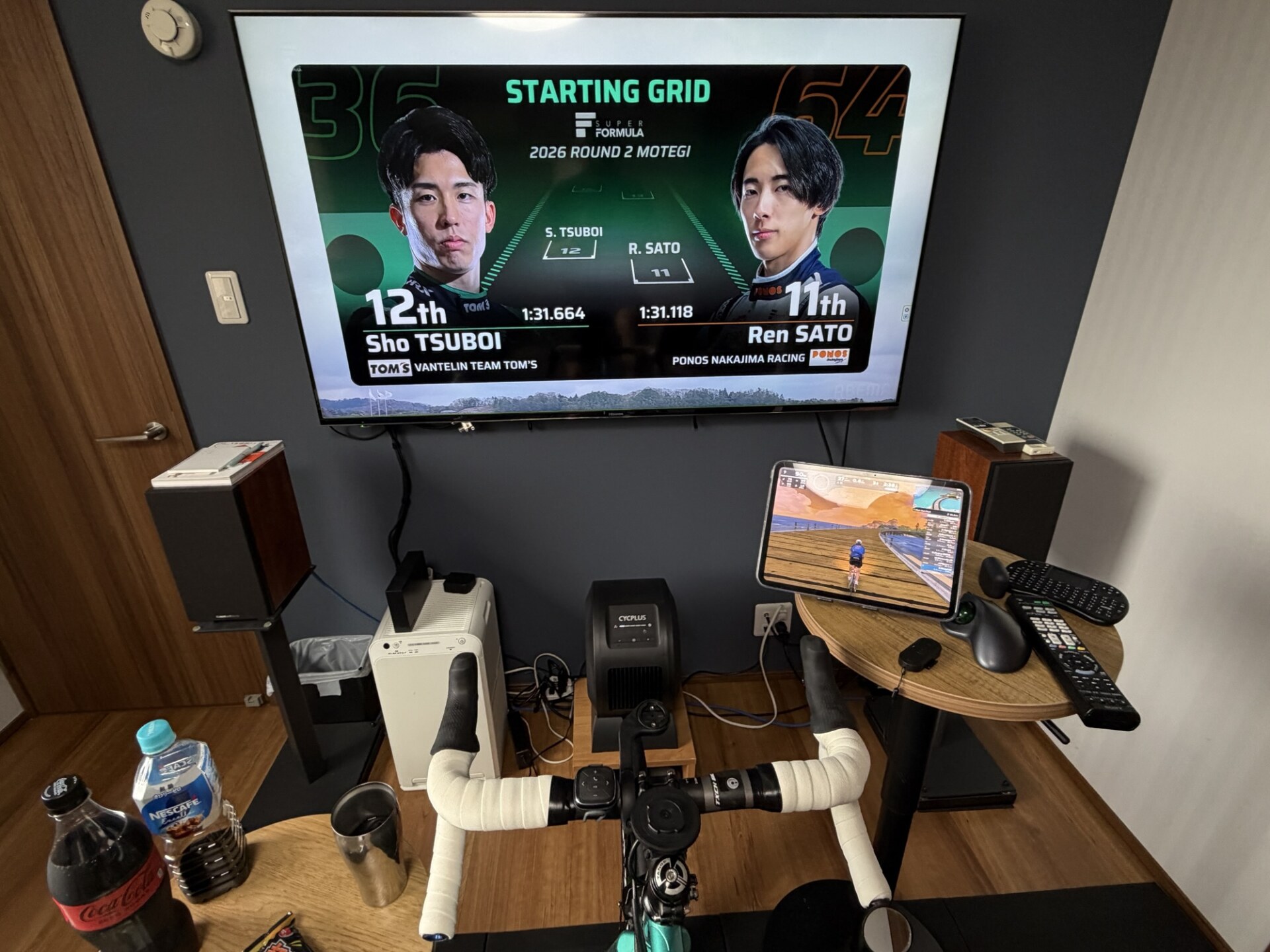 F1は4月開催がお休みなので、スーパーフォーミュラ開幕戦のもてぎラウンドの決勝レース中継を見ながら、Zwiftを回していました。FODはいったん解約したので、Abema TVで生中継で観戦しました。あくまでもレース観戦がメインなので、ZwiftはiPadで起動し、L2以下の楽な領域で軽く回してました。