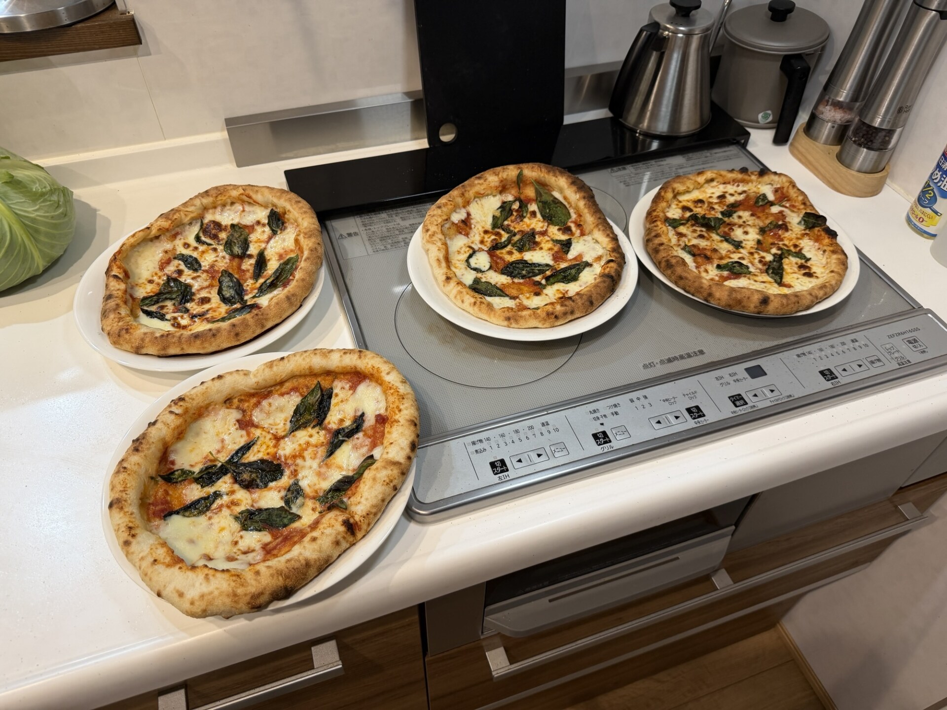 夜は日曜日18時のお楽しみである「田舎暮らしのビル」のYouTube動画を見ながら、午前中に仕込んで発酵させた生地で「耳までチーズのマルゲリータ」を焼きました。今回は小麦粉500gと通常量より増やして、捏ねた後の生地の重さで200gで4等分に取り分けたものを発酵させています(通常は160g)。