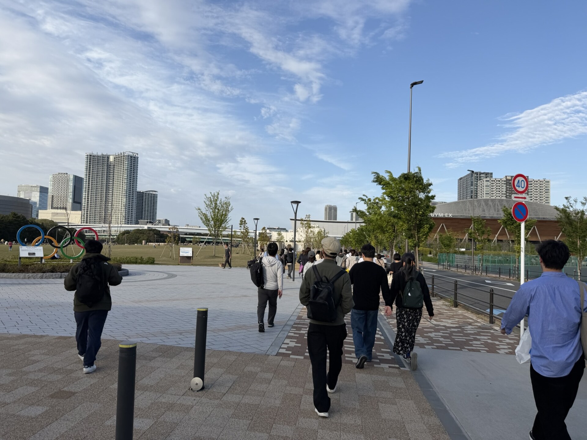 朝練の疲れもありましたので、結局は東雲駅から会場まで2km歩くことはしないで、東雲駅でゆりかもめに乗り換えて、有明アリーナの最寄りである有明テニスの森駅を利用しました。ここからは会場まで徒歩10分ほどです。ご覧のように天気もよくて海風も爽やかでした。