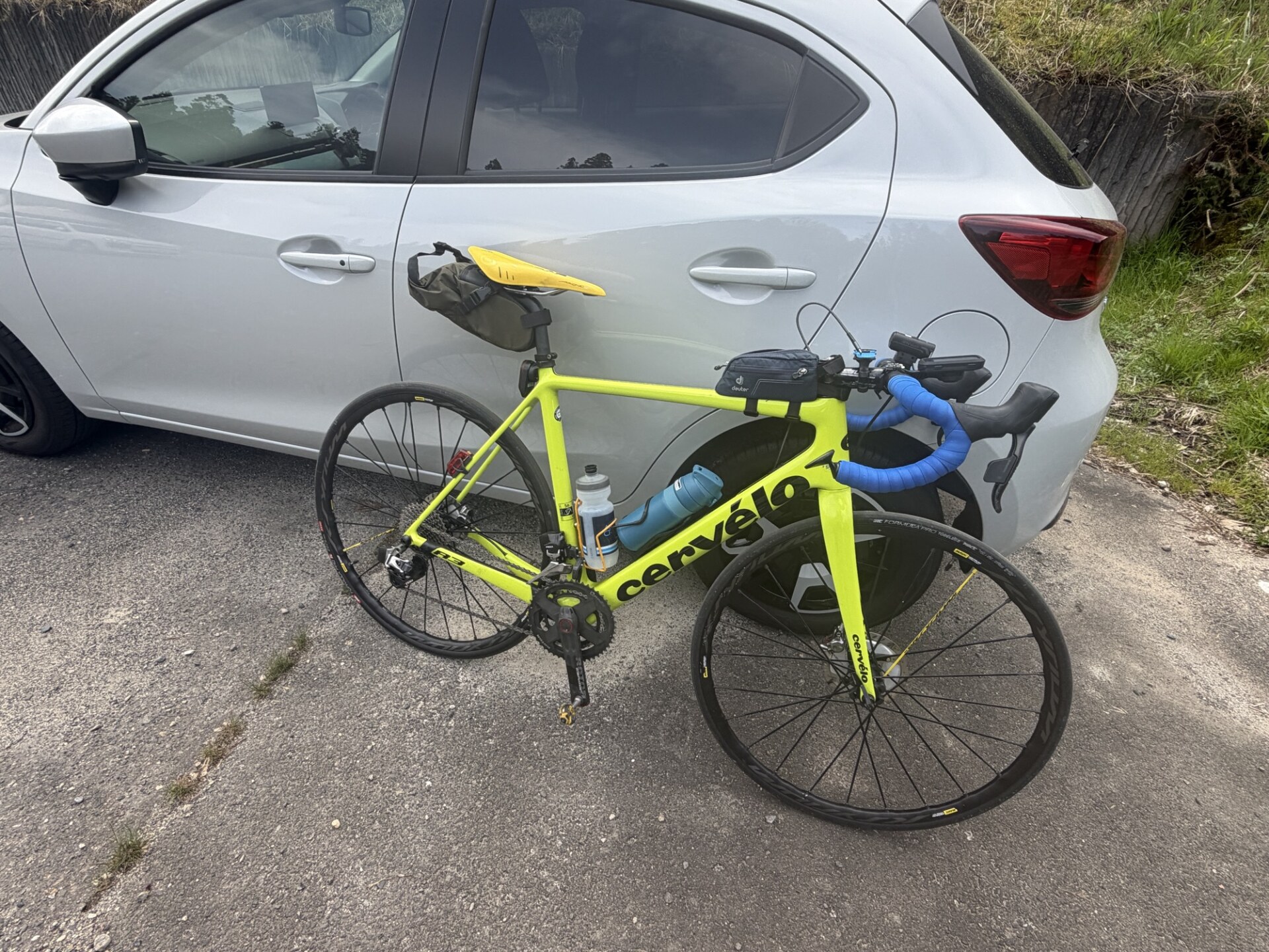 マツダ2はあまり荷室が広くないのですが、前輪を外すだけで荷室に横にしてロードバイクを積めます。毛布などで保護すれば重ねて2台は積めそうです。ヘルメットやシューズ、補給食などブルベ本番時を想定して行動します。