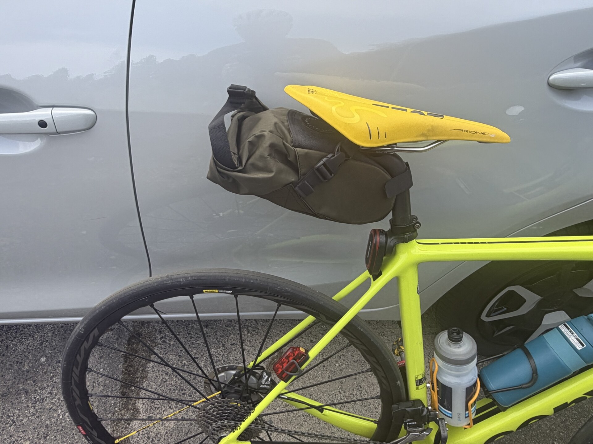 今回はダブルボトル体制として、必要な装備は中型のサドルバッグに収納します。iGPSportのレーダーの実戦デビューでしたが、写真の位置に取り付けるタイプのアダプタだと左に少し出っ張りがあって、足を回した時に内股に擦れます。これは本番までに改善が必要です。