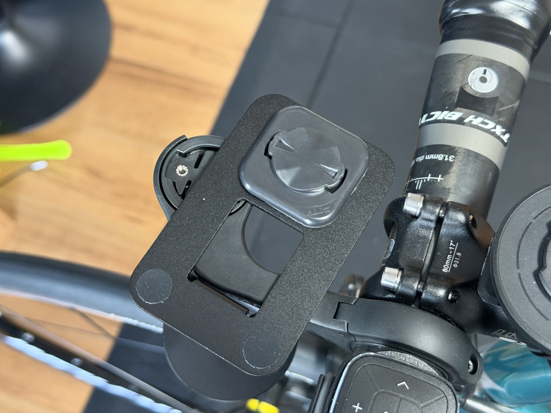 ゴム足を剥がして、そこにGarmin Edgeのマウントアダプタを強力な両面テープで貼り付けるだけです。以前、AliExpressでまとめ買いしたマウントアダプタの手持ちが残っていました。簡単な改造ですが、非常にスタイリッシュにiPadを自転車に固定できました。