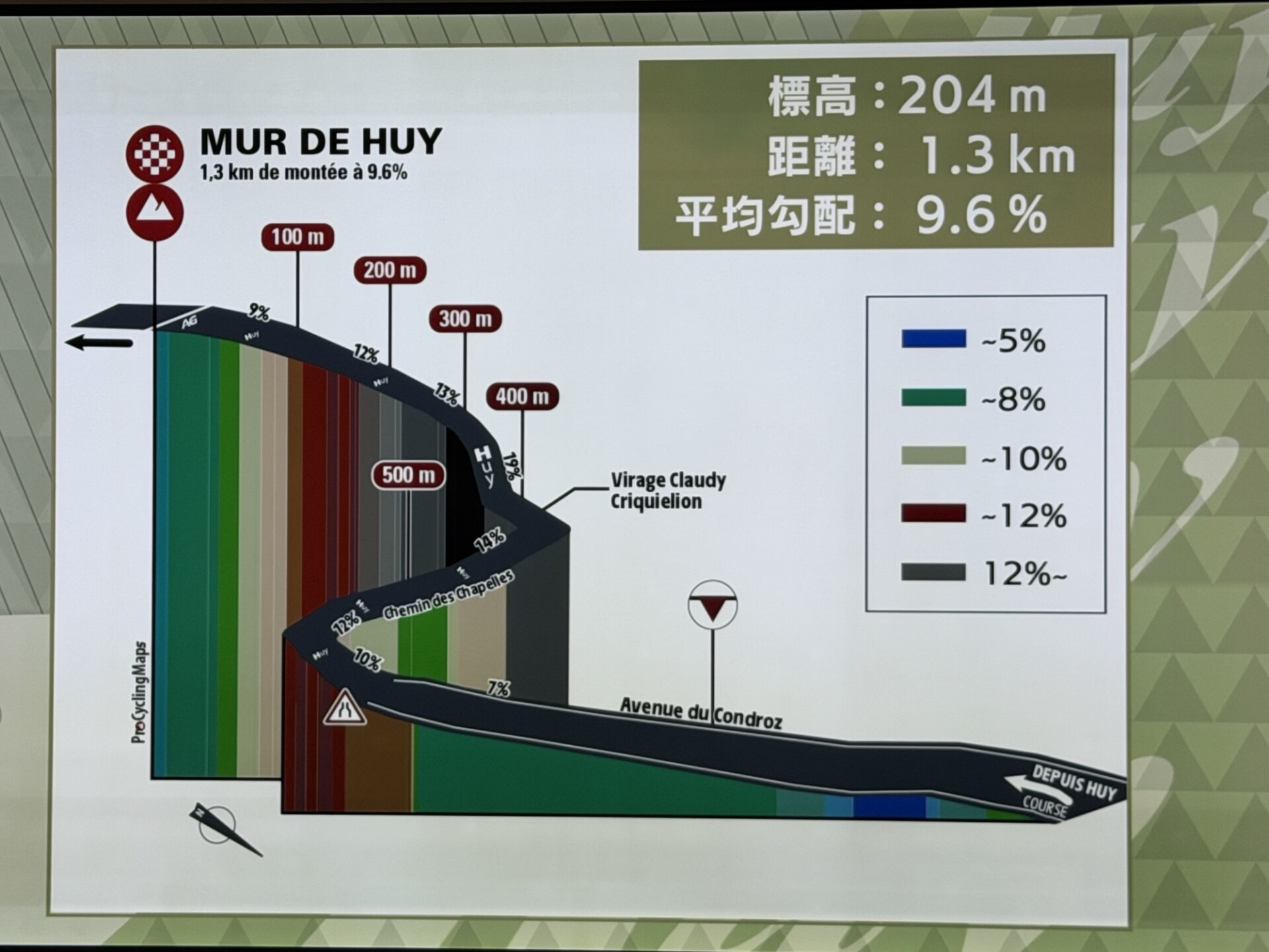 写真はゴール前にある激坂「ユイの壁」のコースプロフィール。Huyと書いてある部分がそうなのですが、ここの斜度はえげつないですね。流石に当日中にゴールまで見届けるのは深夜におよぶので、翌朝に追いかけ再生でゴールを見届けました。