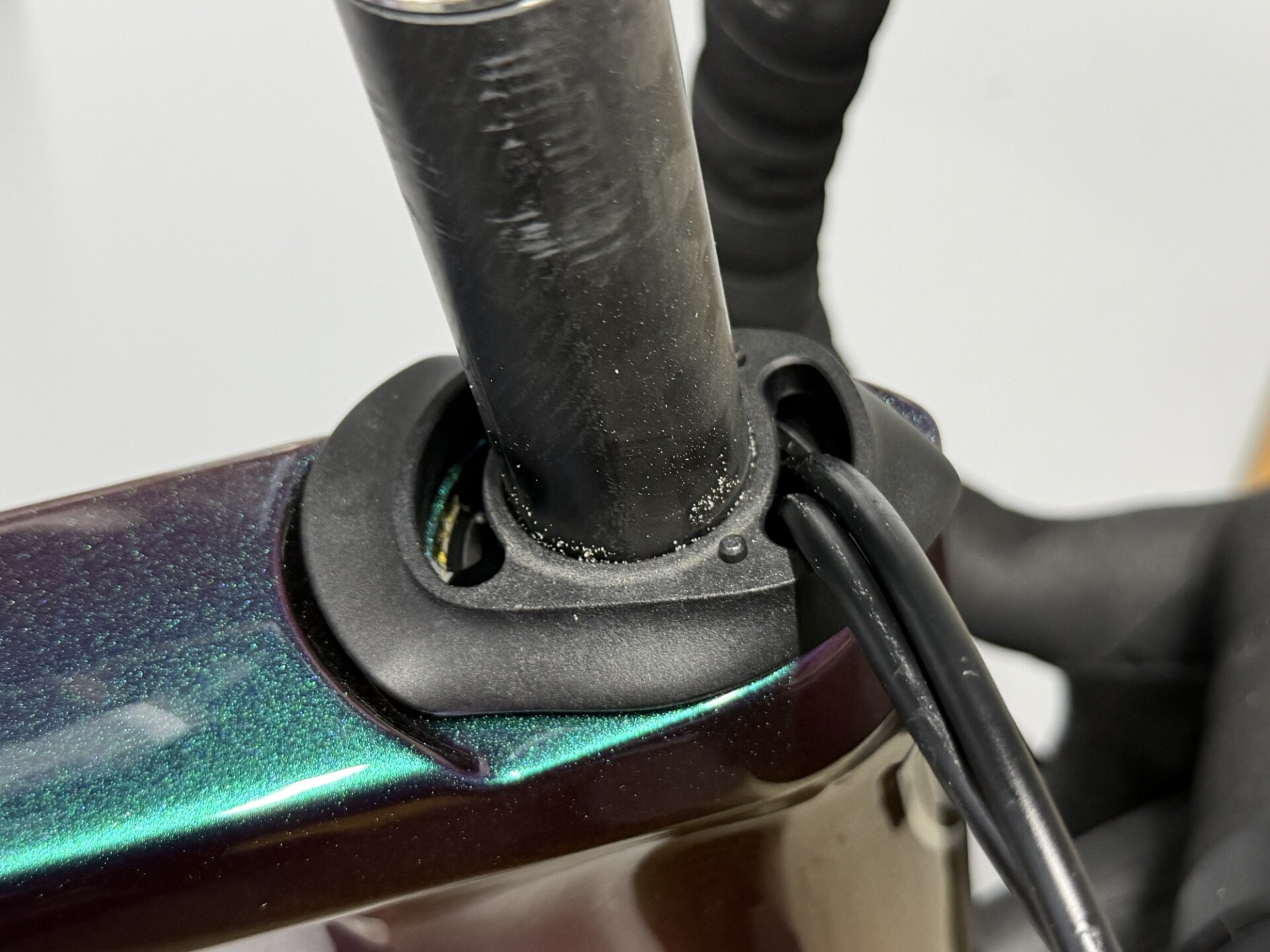 最新のエアロロードでよく分からないのがヘッドパーツ周りです。ブレーキ用の油圧ホースがフレームの中を取っていて、ヘッドパーツのあたりから中に入っていきます。この辺は作業済みなので戸惑うことはありません。
